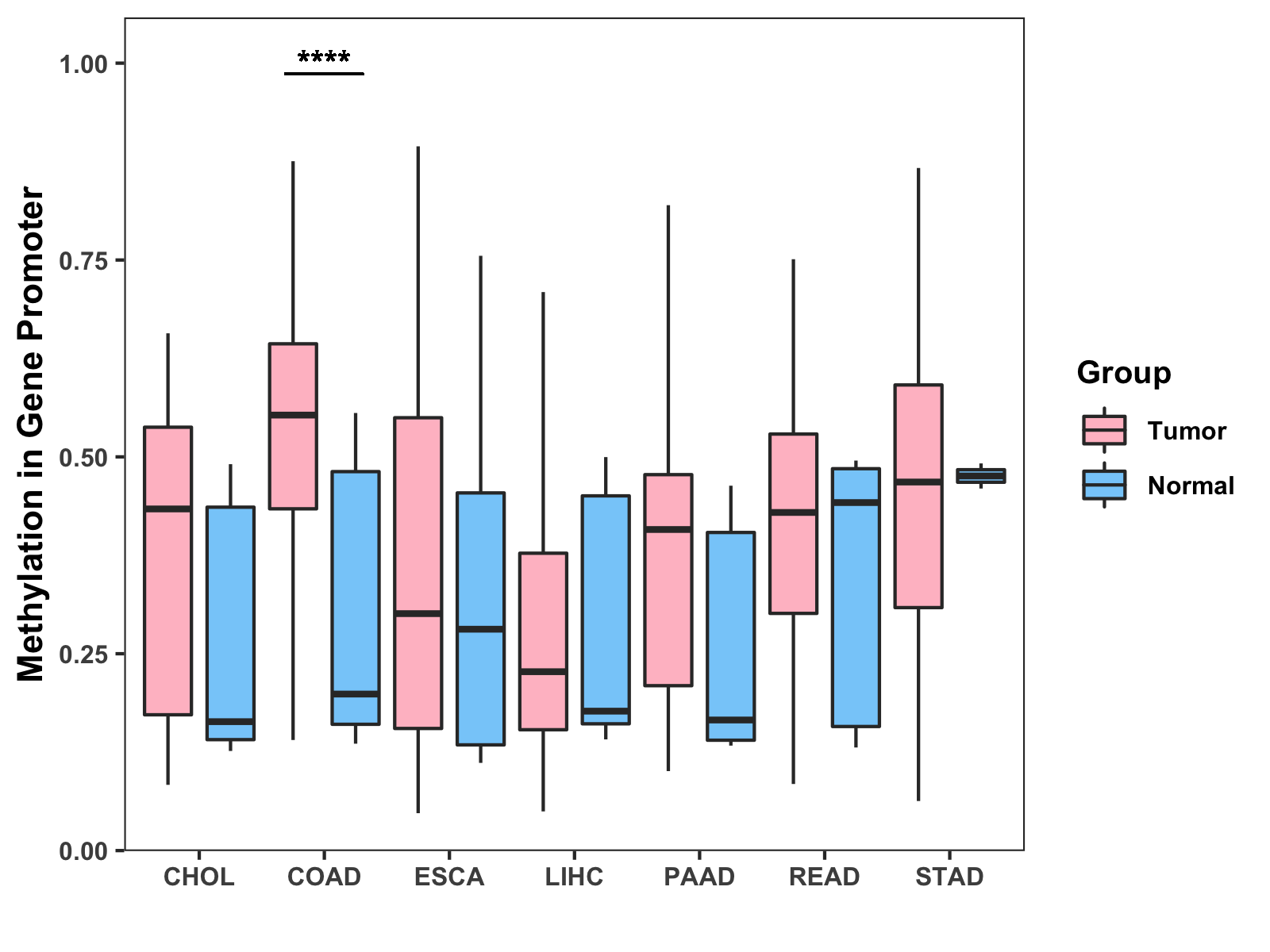 Boxplot of All Gastrointestinal Cancer ( * : 0.01-0.05 , ** : 0.005-0.01 , *** : 0.0001-0.005 , **** : < 0.0001 ) |