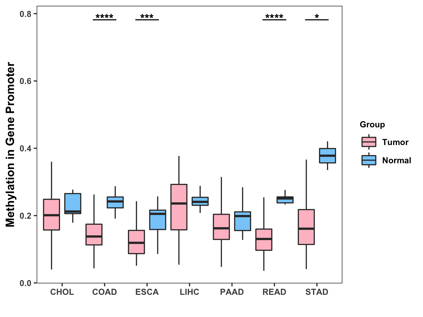 Boxplot of All Gastrointestinal Cancer ( * : 0.01-0.05 , ** : 0.005-0.01 , *** : 0.0001-0.005 , **** : < 0.0001 ) |