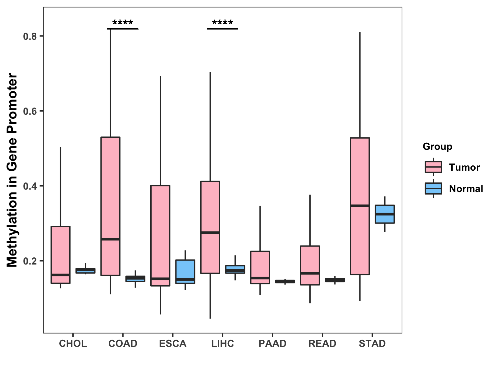 Boxplot of All Gastrointestinal Cancer ( * : 0.01-0.05 , ** : 0.005-0.01 , *** : 0.0001-0.005 , **** : < 0.0001 ) |