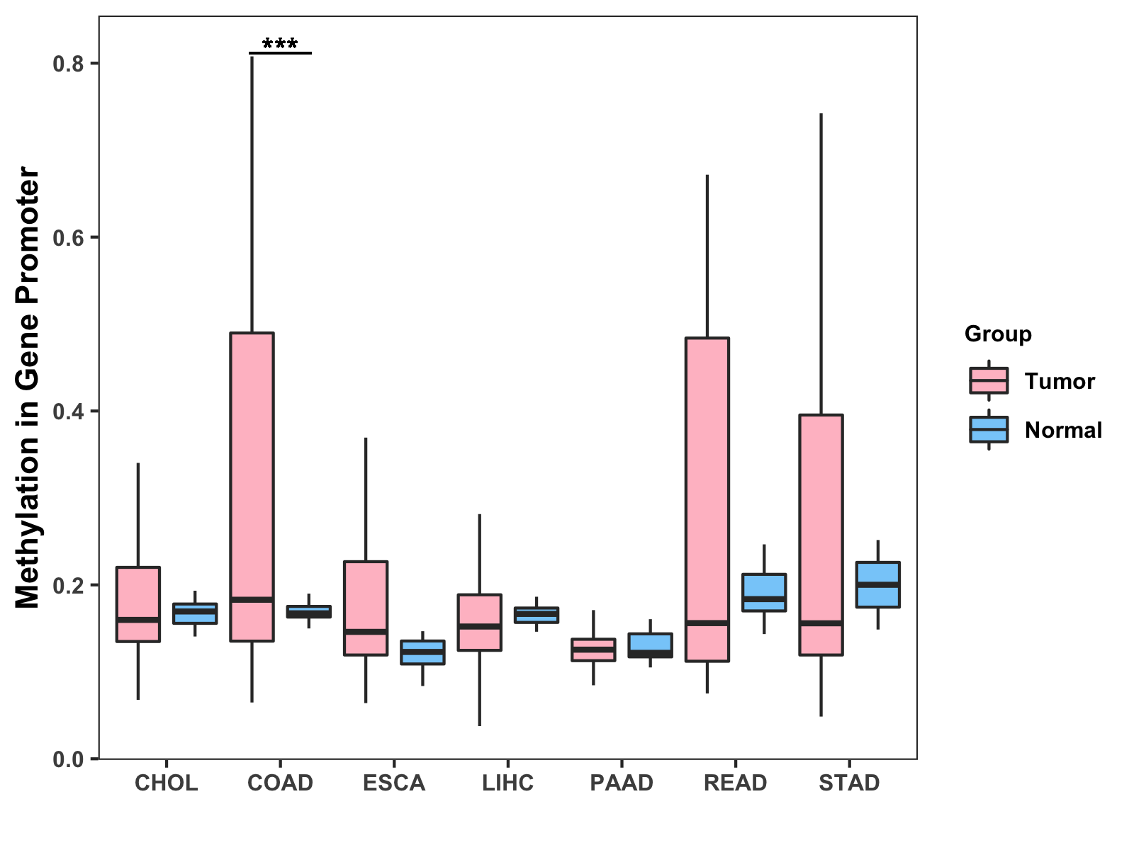 Boxplot of All Gastrointestinal Cancer ( * : 0.01-0.05 , ** : 0.005-0.01 , *** : 0.0001-0.005 , **** : < 0.0001 ) |