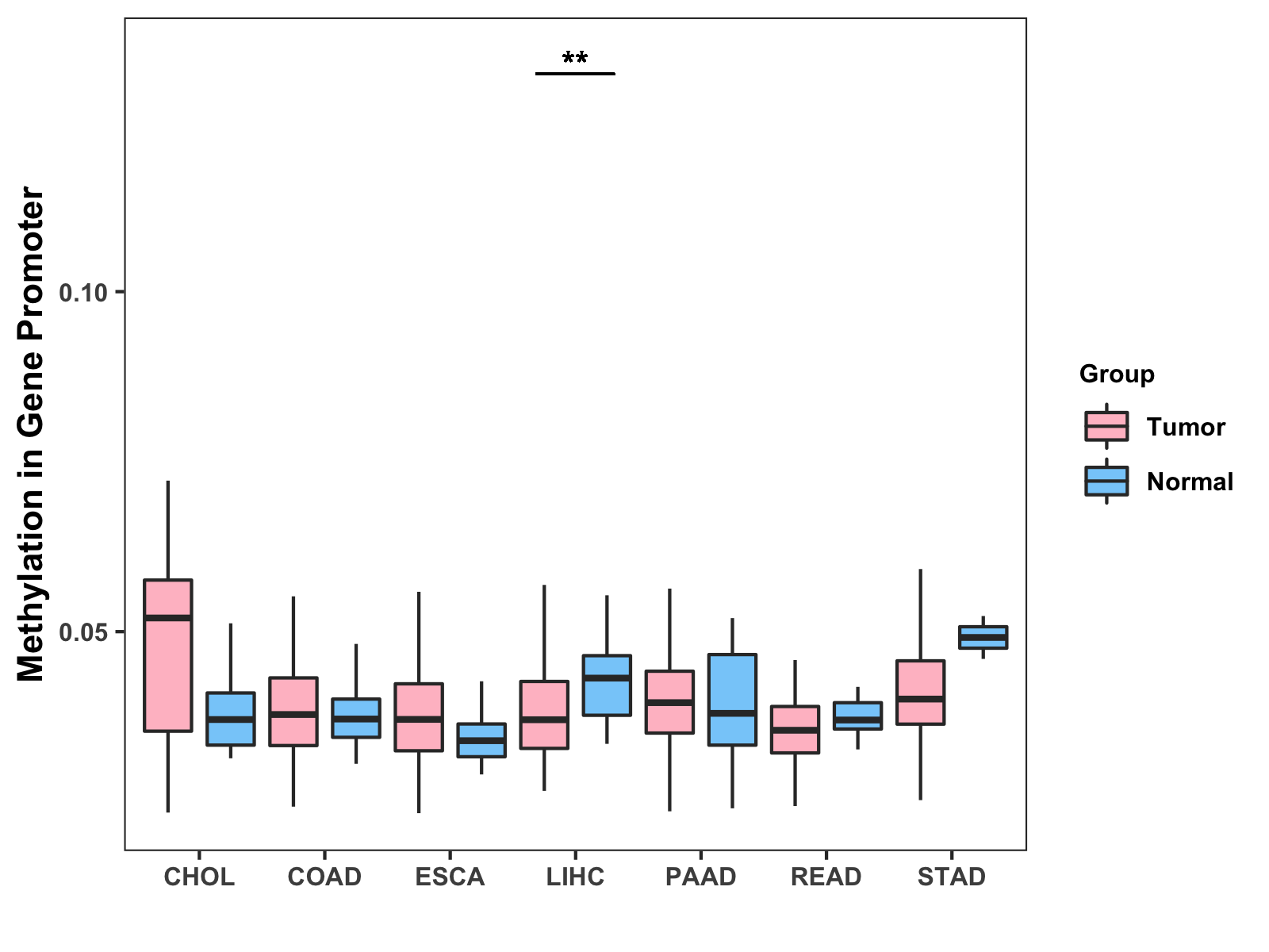 Boxplot of All Gastrointestinal Cancer ( * : 0.01-0.05 , ** : 0.005-0.01 , *** : 0.0001-0.005 , **** : < 0.0001 ) |