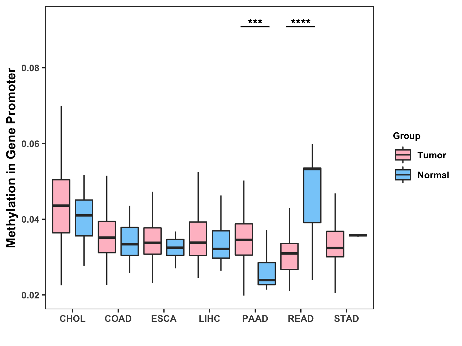 Boxplot of All Gastrointestinal Cancer ( * : 0.01-0.05 , ** : 0.005-0.01 , *** : 0.0001-0.005 , **** : < 0.0001 ) |