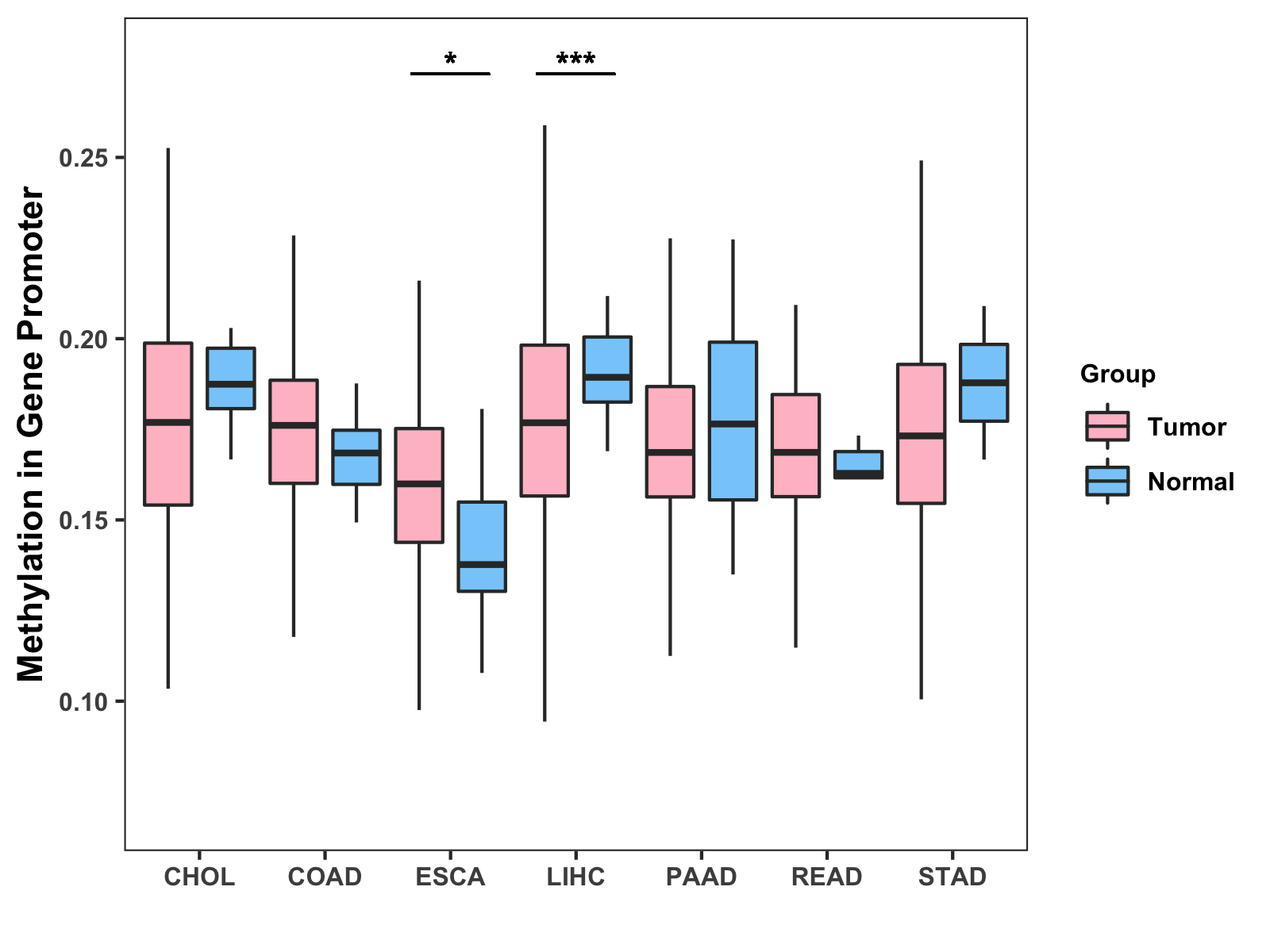 Boxplot of All Gastrointestinal Cancer ( * : 0.01-0.05 , ** : 0.005-0.01 , *** : 0.0001-0.005 , **** : < 0.0001 ) |