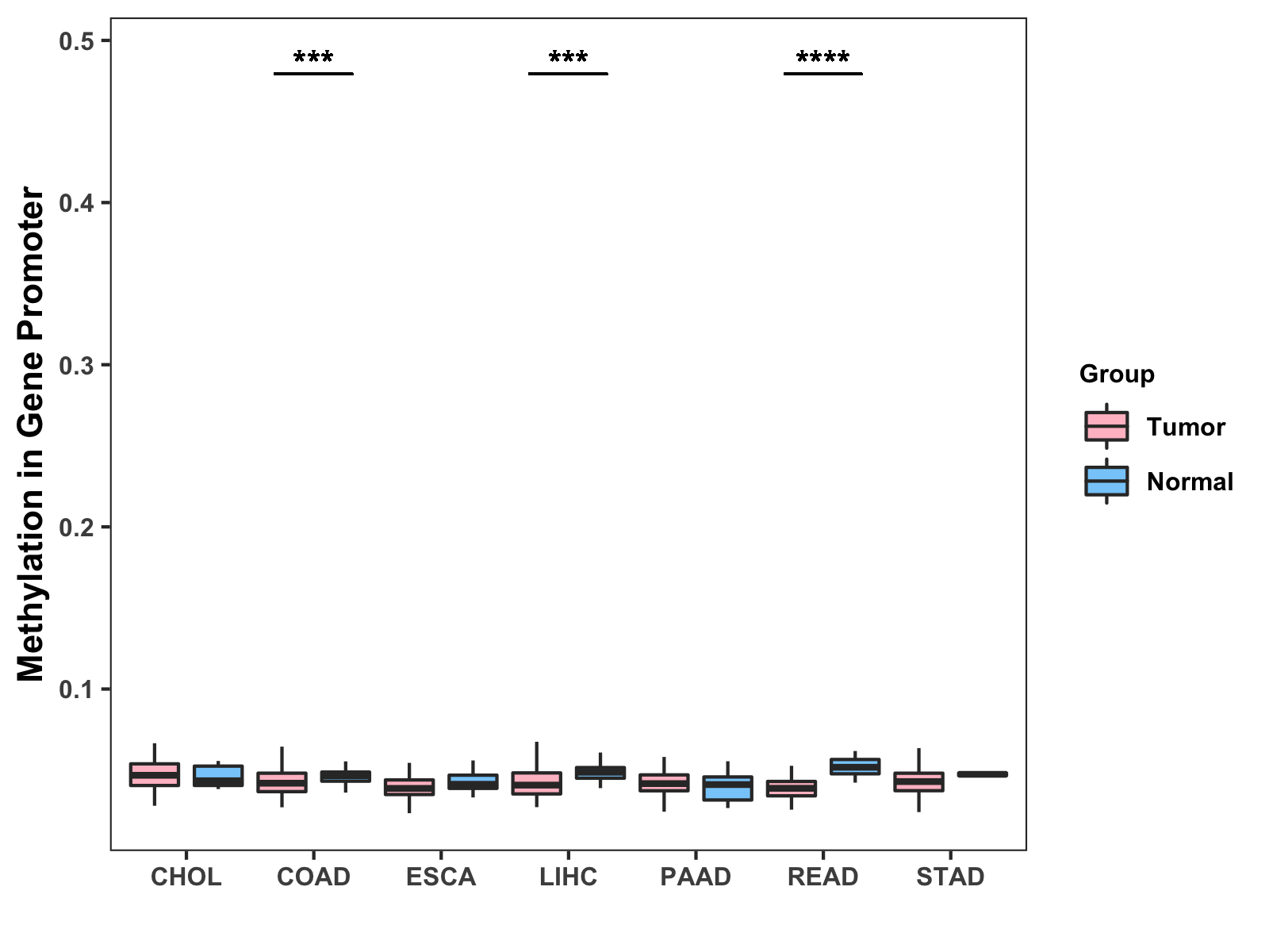 Boxplot of All Gastrointestinal Cancer ( * : 0.01-0.05 , ** : 0.005-0.01 , *** : 0.0001-0.005 , **** : < 0.0001 ) |