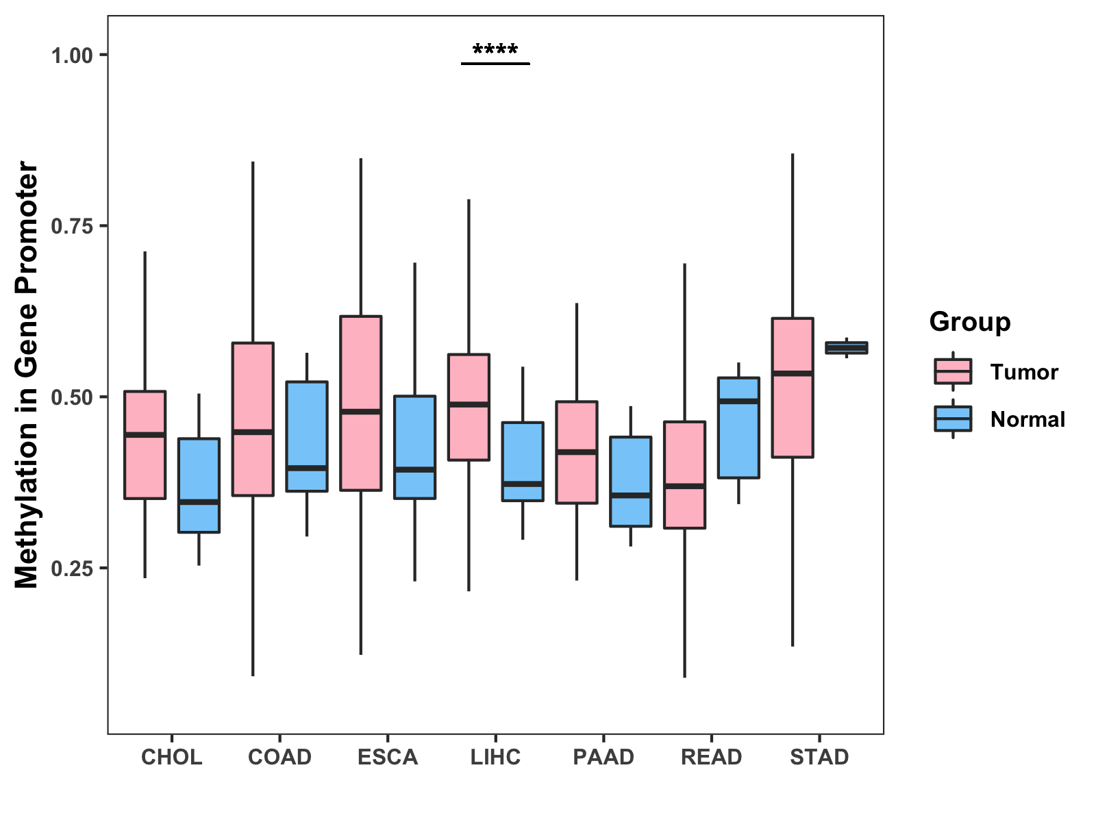 Boxplot of All Gastrointestinal Cancer ( * : 0.01-0.05 , ** : 0.005-0.01 , *** : 0.0001-0.005 , **** : < 0.0001 ) |