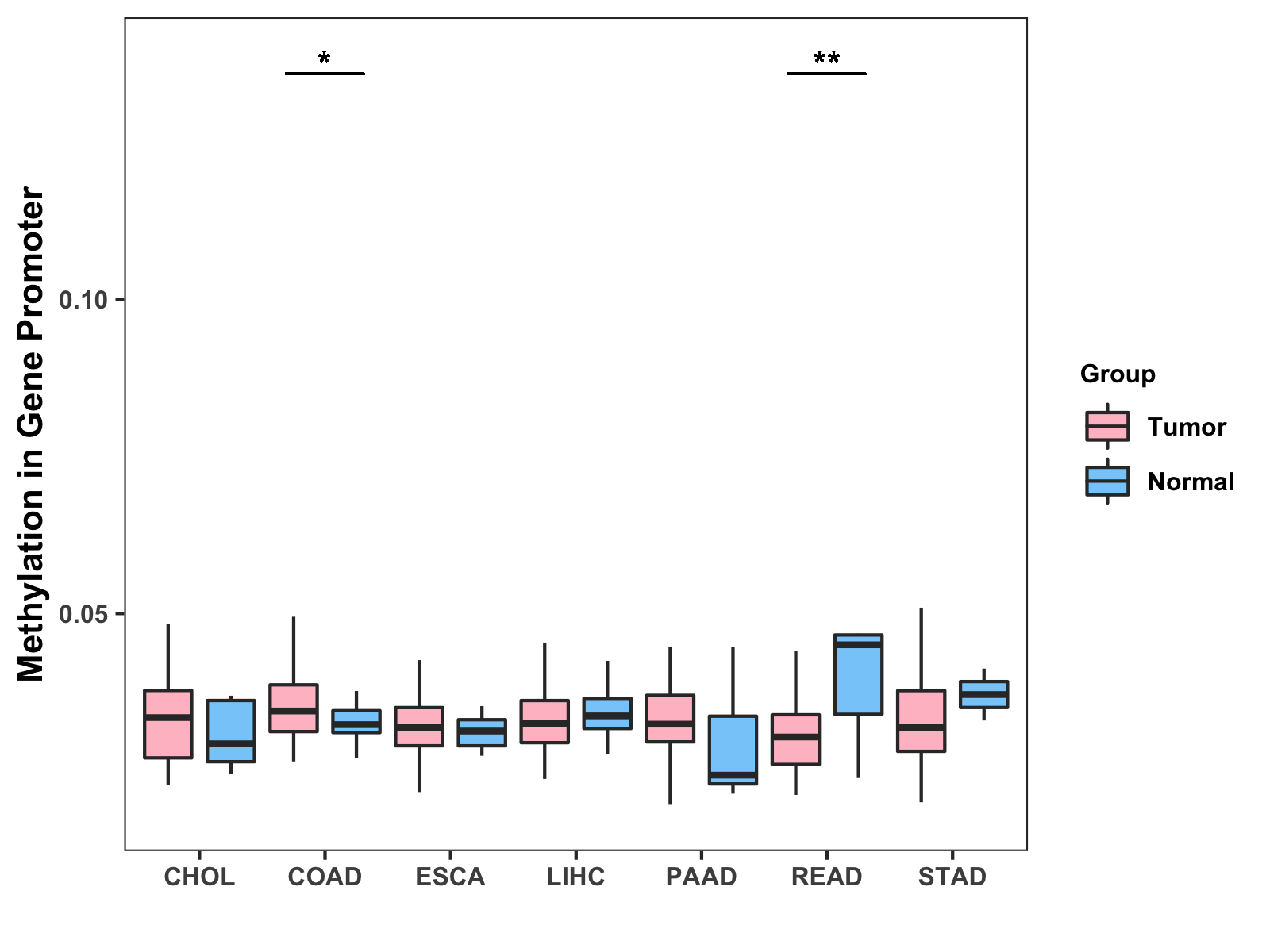 Boxplot of All Gastrointestinal Cancer ( * : 0.01-0.05 , ** : 0.005-0.01 , *** : 0.0001-0.005 , **** : < 0.0001 ) |