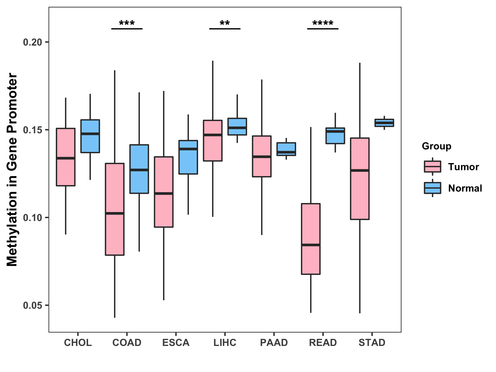Boxplot of All Gastrointestinal Cancer ( * : 0.01-0.05 , ** : 0.005-0.01 , *** : 0.0001-0.005 , **** : < 0.0001 ) |