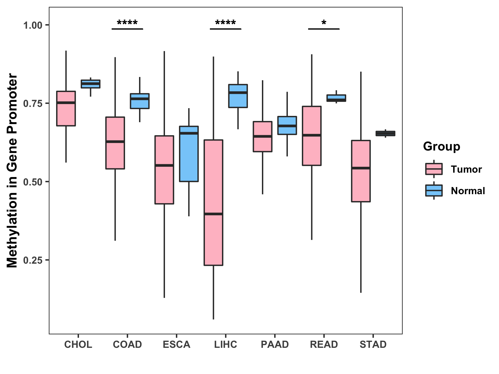 Boxplot of All Gastrointestinal Cancer ( * : 0.01-0.05 , ** : 0.005-0.01 , *** : 0.0001-0.005 , **** : < 0.0001 ) |