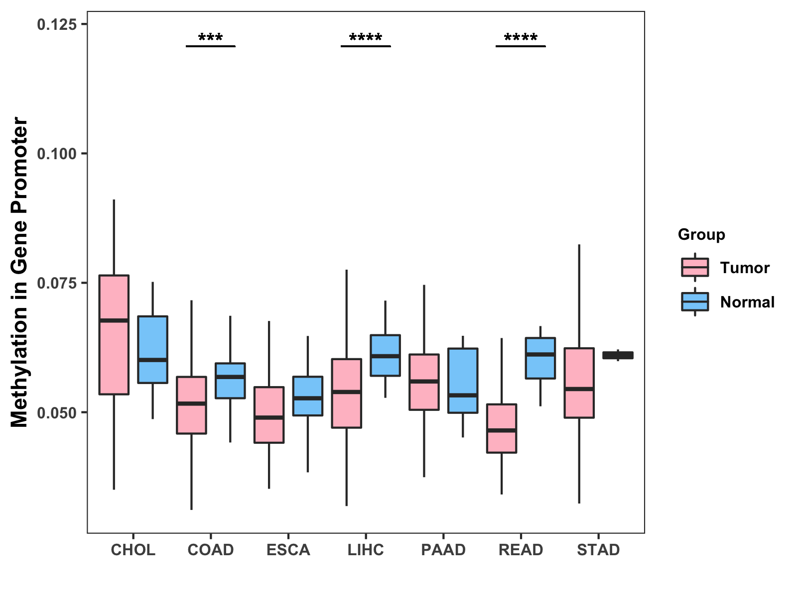 Boxplot of All Gastrointestinal Cancer ( * : 0.01-0.05 , ** : 0.005-0.01 , *** : 0.0001-0.005 , **** : < 0.0001 ) |
