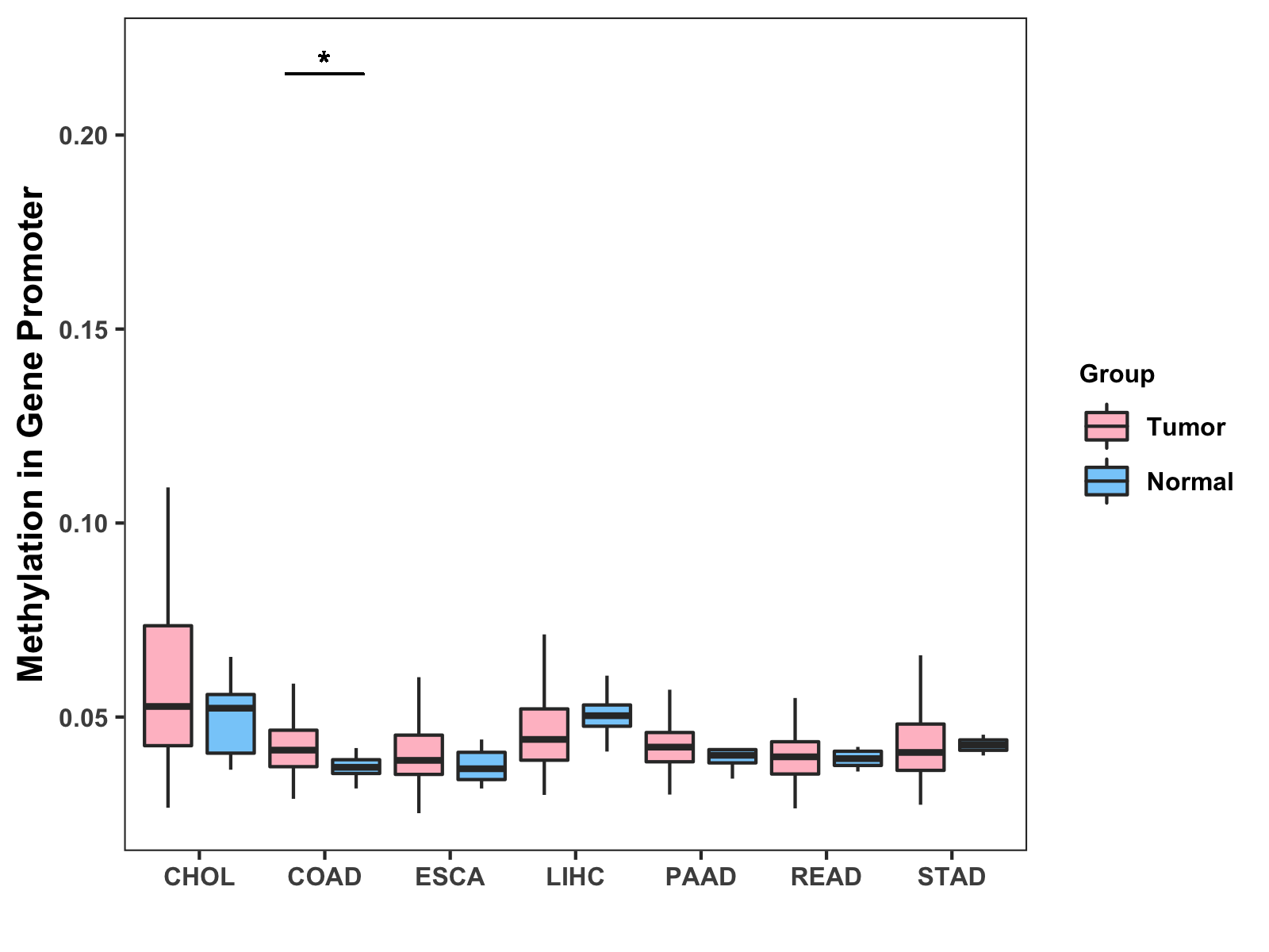 Boxplot of All Gastrointestinal Cancer ( * : 0.01-0.05 , ** : 0.005-0.01 , *** : 0.0001-0.005 , **** : < 0.0001 ) |