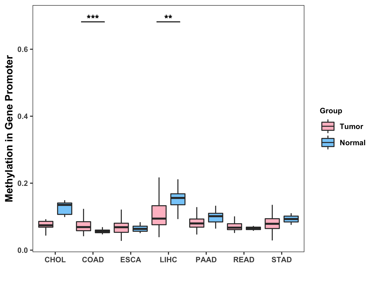 Boxplot of All Gastrointestinal Cancer ( * : 0.01-0.05 , ** : 0.005-0.01 , *** : 0.0001-0.005 , **** : < 0.0001 ) |