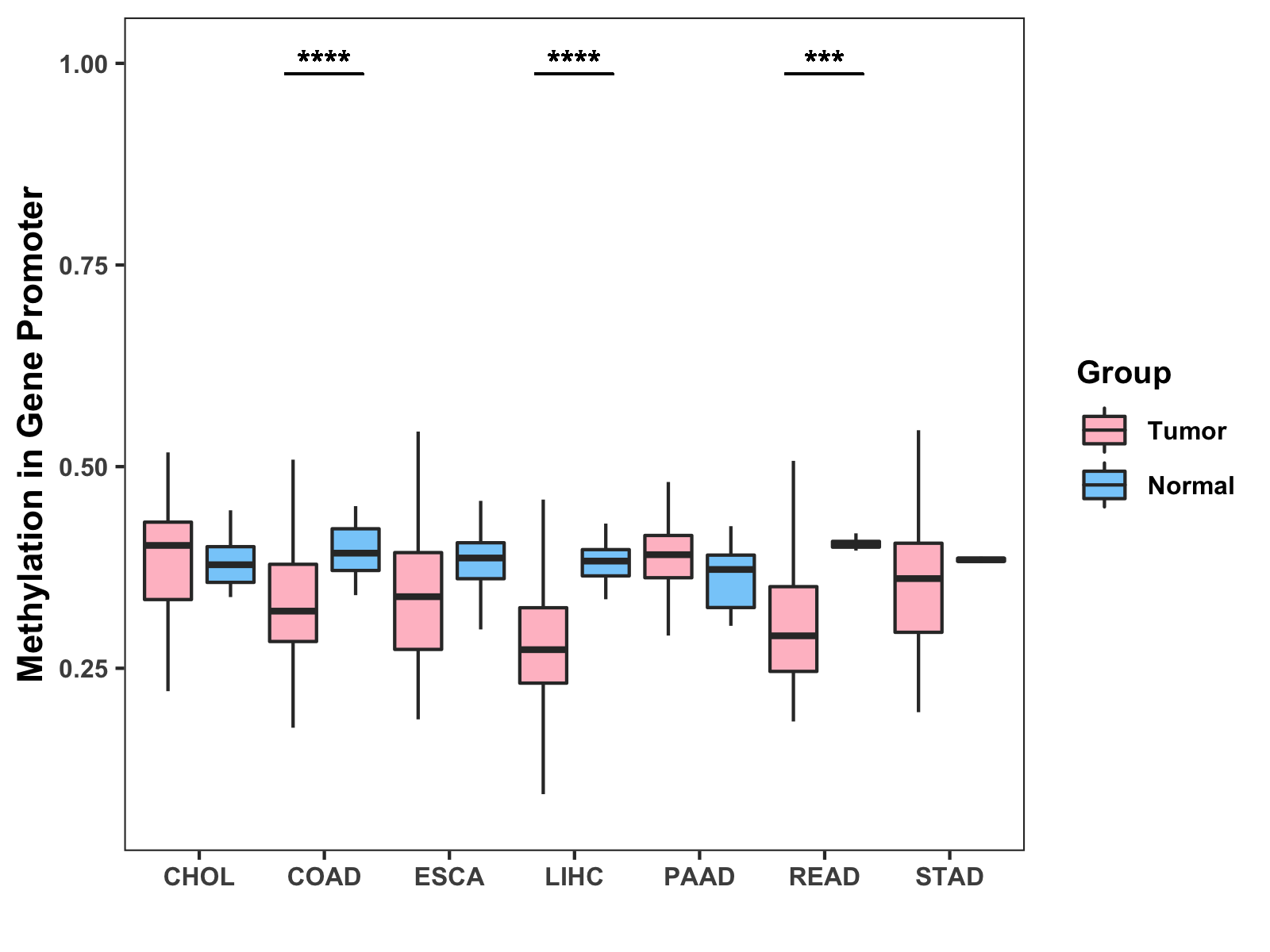 Boxplot of All Gastrointestinal Cancer ( * : 0.01-0.05 , ** : 0.005-0.01 , *** : 0.0001-0.005 , **** : < 0.0001 ) |