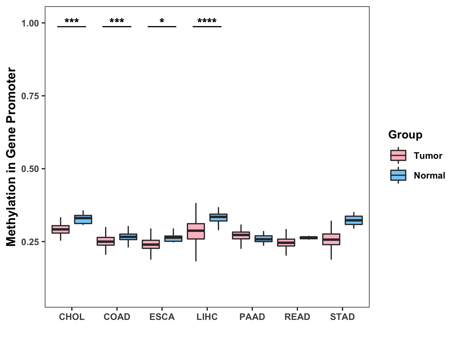 Boxplot of All Gastrointestinal Cancer ( * : 0.01-0.05 , ** : 0.005-0.01 , *** : 0.0001-0.005 , **** : < 0.0001 ) |