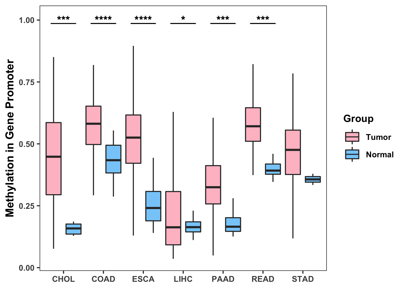 Boxplot of All Gastrointestinal Cancer ( * : 0.01-0.05 , ** : 0.005-0.01 , *** : 0.0001-0.005 , **** : < 0.0001 ) |