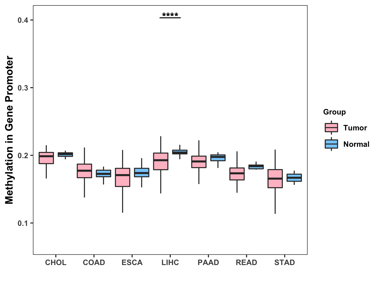 Boxplot of All Gastrointestinal Cancer ( * : 0.01-0.05 , ** : 0.005-0.01 , *** : 0.0001-0.005 , **** : < 0.0001 ) |
