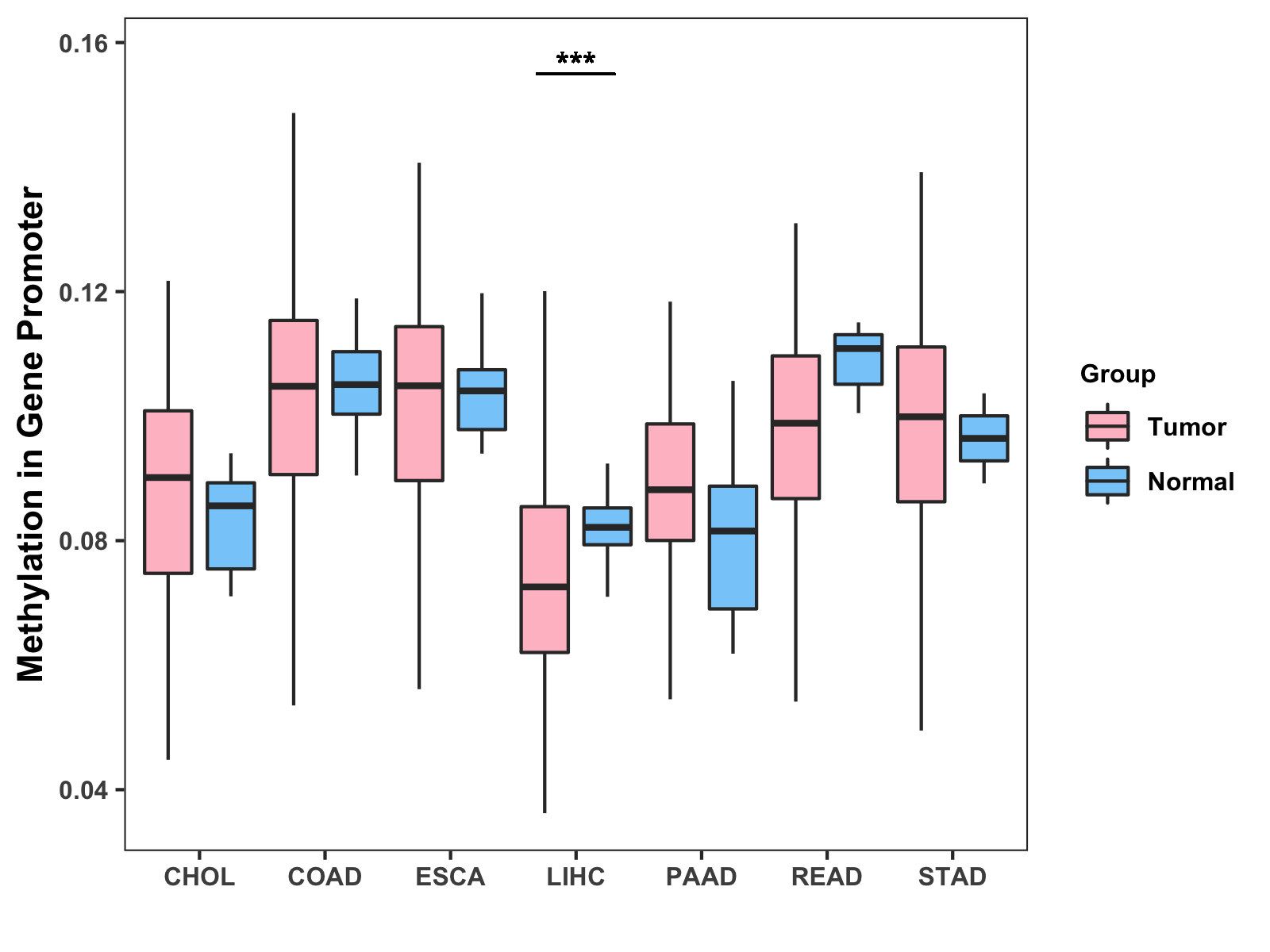 Boxplot of All Gastrointestinal Cancer ( * : 0.01-0.05 , ** : 0.005-0.01 , *** : 0.0001-0.005 , **** : < 0.0001 ) |