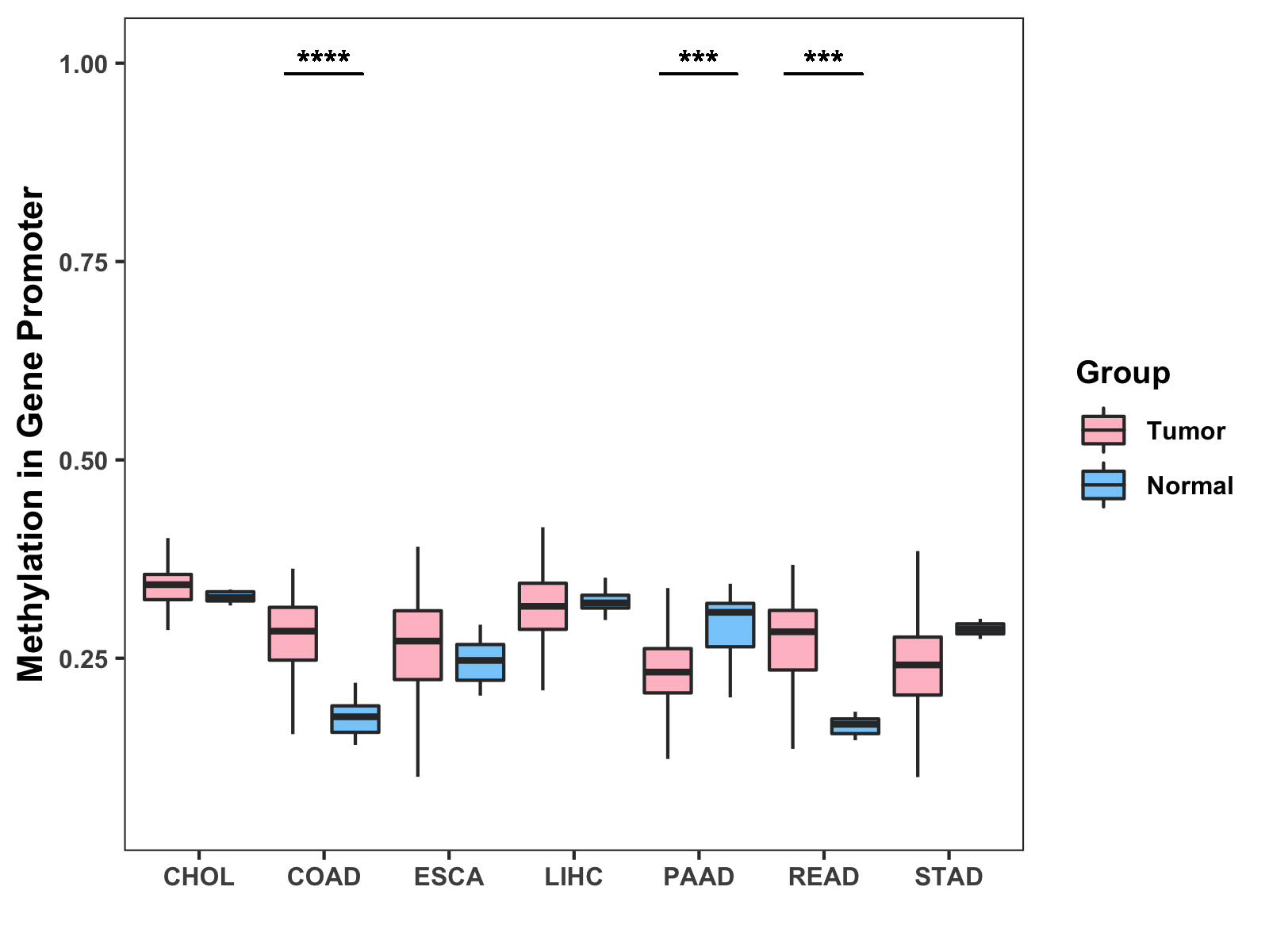 Boxplot of All Gastrointestinal Cancer ( * : 0.01-0.05 , ** : 0.005-0.01 , *** : 0.0001-0.005 , **** : < 0.0001 ) |