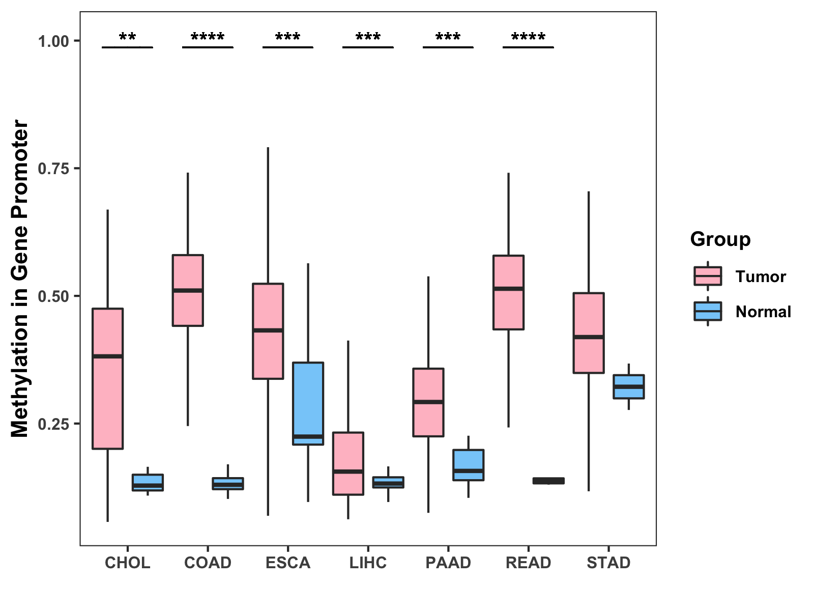 Boxplot of All Gastrointestinal Cancer ( * : 0.01-0.05 , ** : 0.005-0.01 , *** : 0.0001-0.005 , **** : < 0.0001 ) |