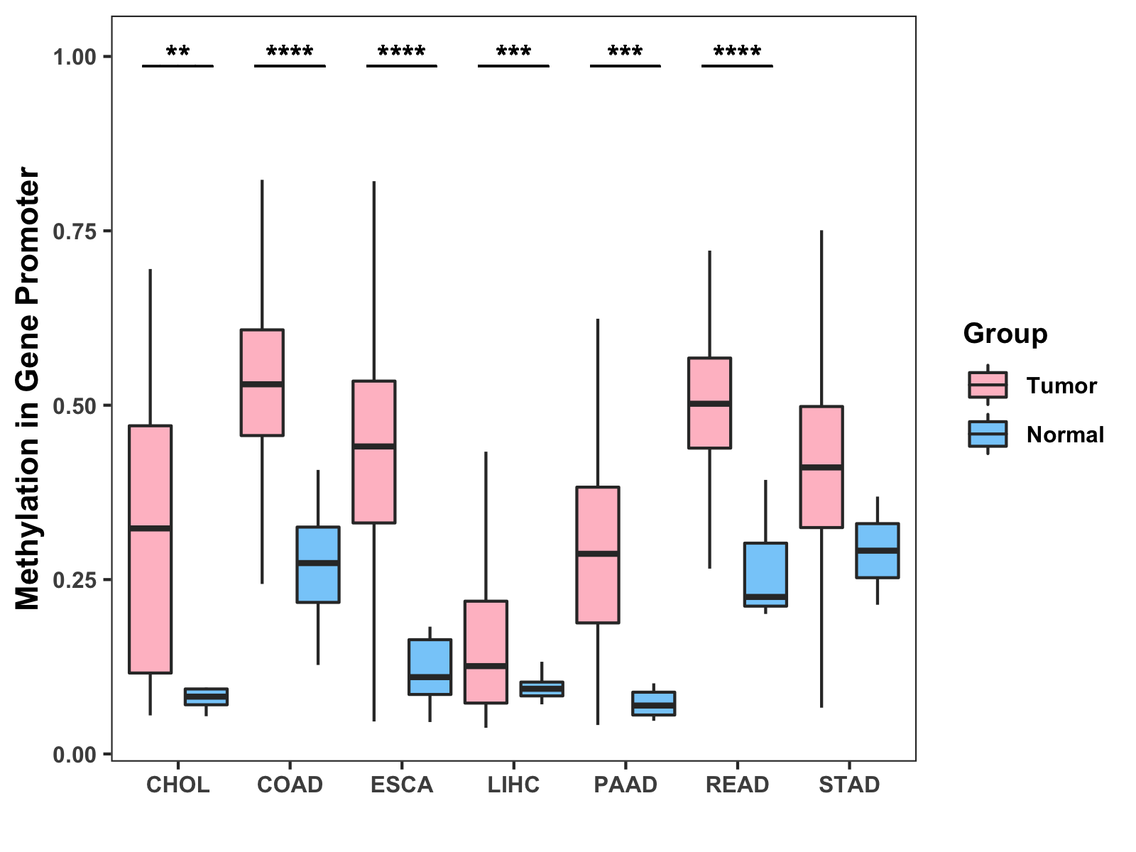 Boxplot of All Gastrointestinal Cancer ( * : 0.01-0.05 , ** : 0.005-0.01 , *** : 0.0001-0.005 , **** : < 0.0001 ) |