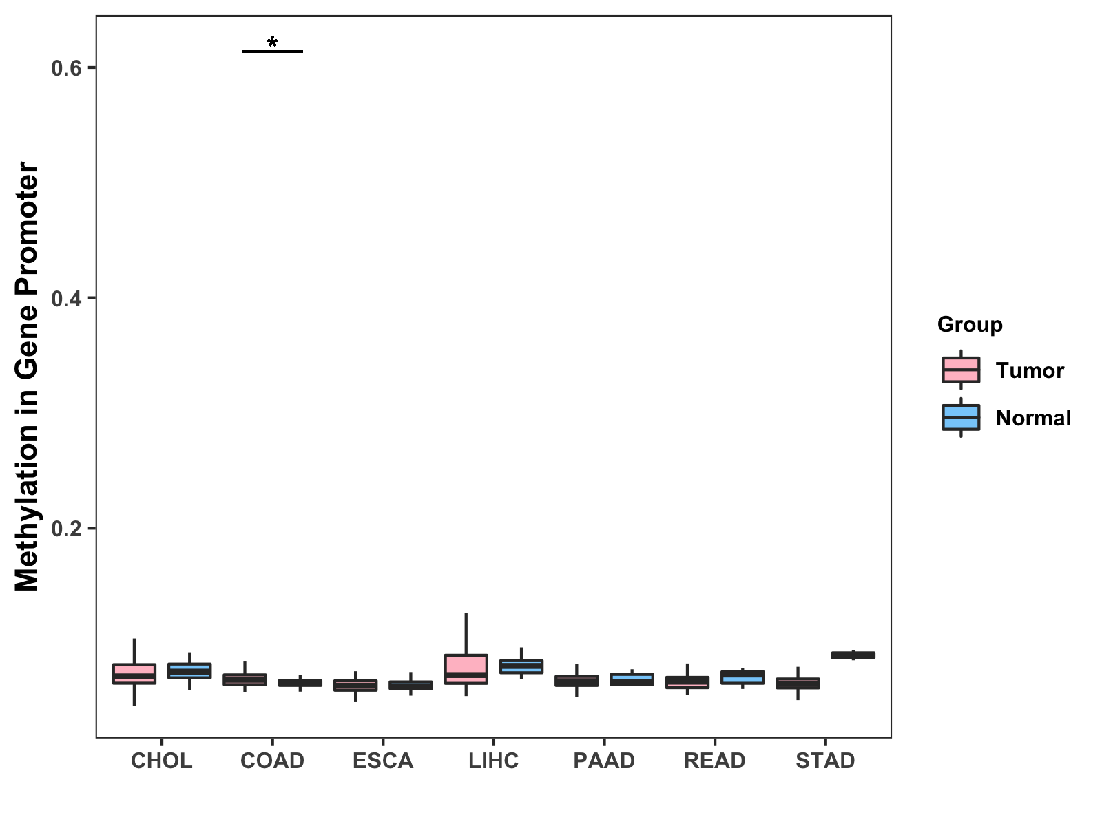Boxplot of All Gastrointestinal Cancer ( * : 0.01-0.05 , ** : 0.005-0.01 , *** : 0.0001-0.005 , **** : < 0.0001 ) |