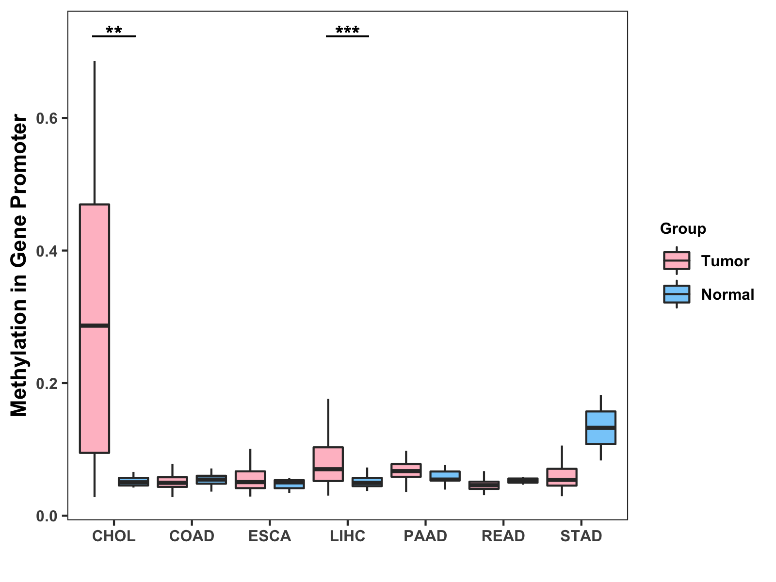 Boxplot of All Gastrointestinal Cancer ( * : 0.01-0.05 , ** : 0.005-0.01 , *** : 0.0001-0.005 , **** : < 0.0001 ) |