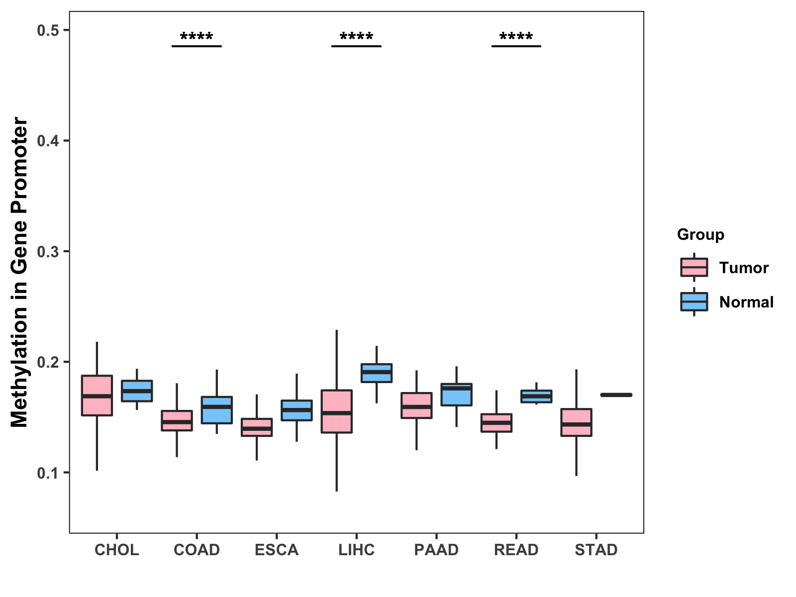 Boxplot of All Gastrointestinal Cancer ( * : 0.01-0.05 , ** : 0.005-0.01 , *** : 0.0001-0.005 , **** : < 0.0001 ) |