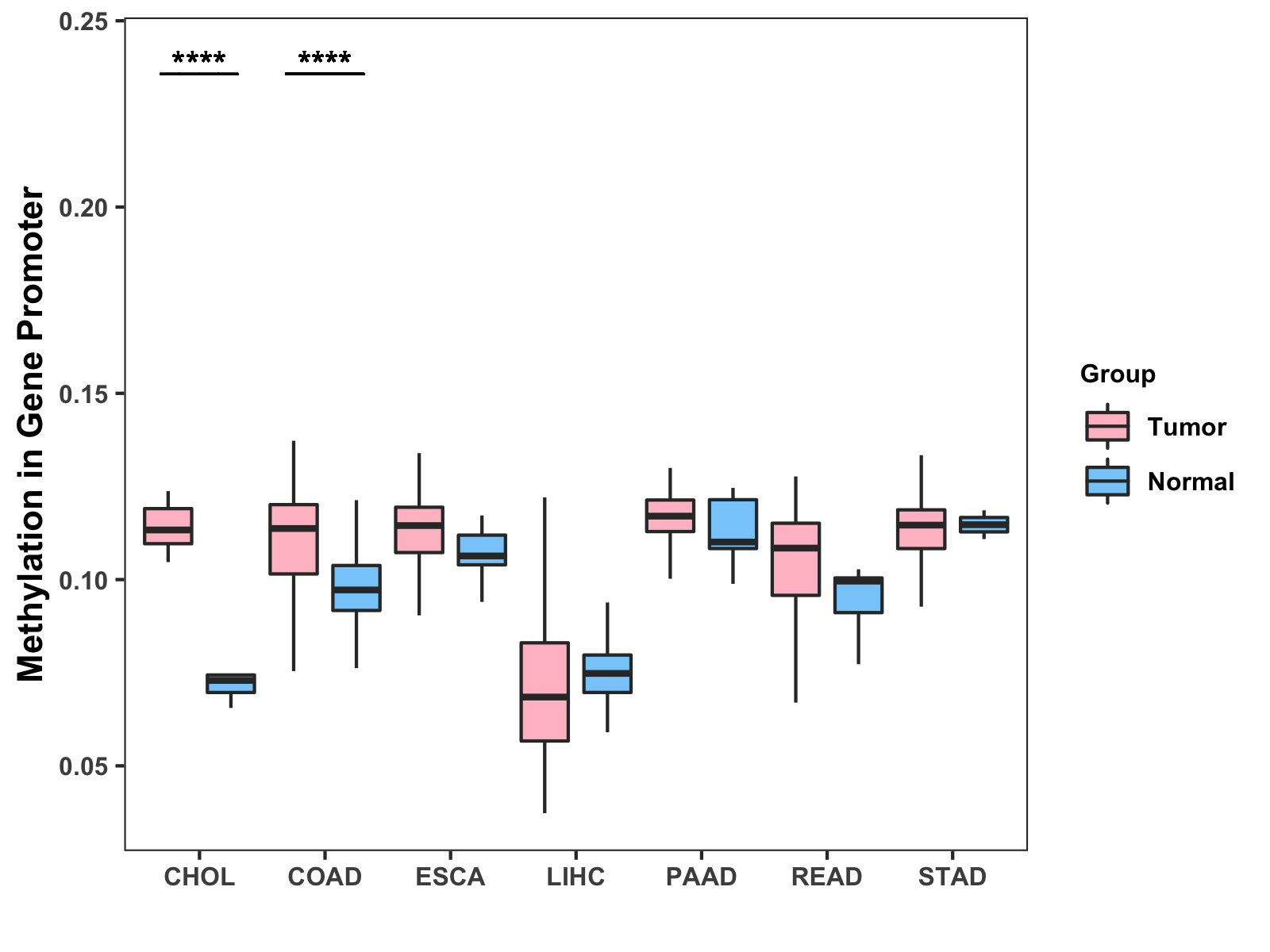 Boxplot of All Gastrointestinal Cancer ( * : 0.01-0.05 , ** : 0.005-0.01 , *** : 0.0001-0.005 , **** : < 0.0001 ) |