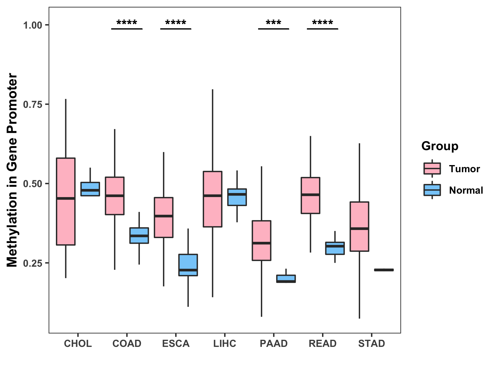 Boxplot of All Gastrointestinal Cancer ( * : 0.01-0.05 , ** : 0.005-0.01 , *** : 0.0001-0.005 , **** : < 0.0001 ) |