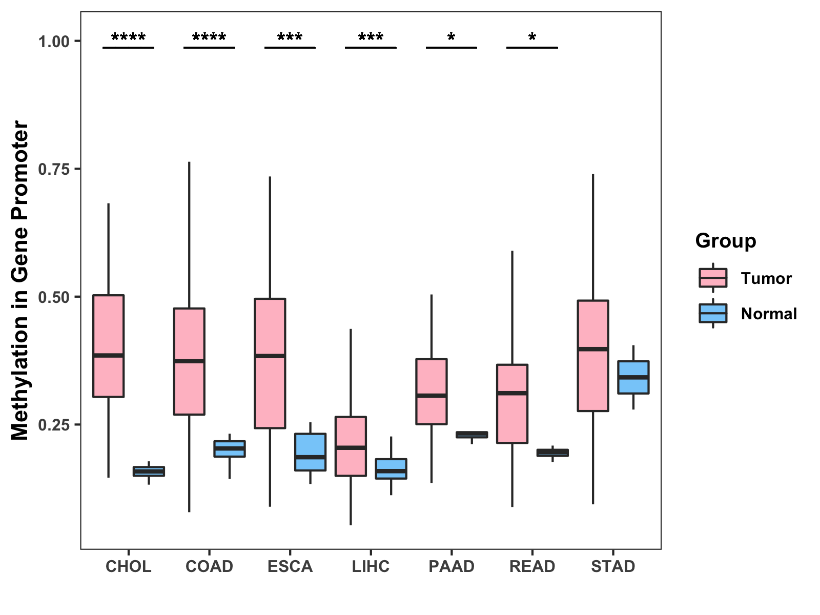 Boxplot of All Gastrointestinal Cancer ( * : 0.01-0.05 , ** : 0.005-0.01 , *** : 0.0001-0.005 , **** : < 0.0001 ) |