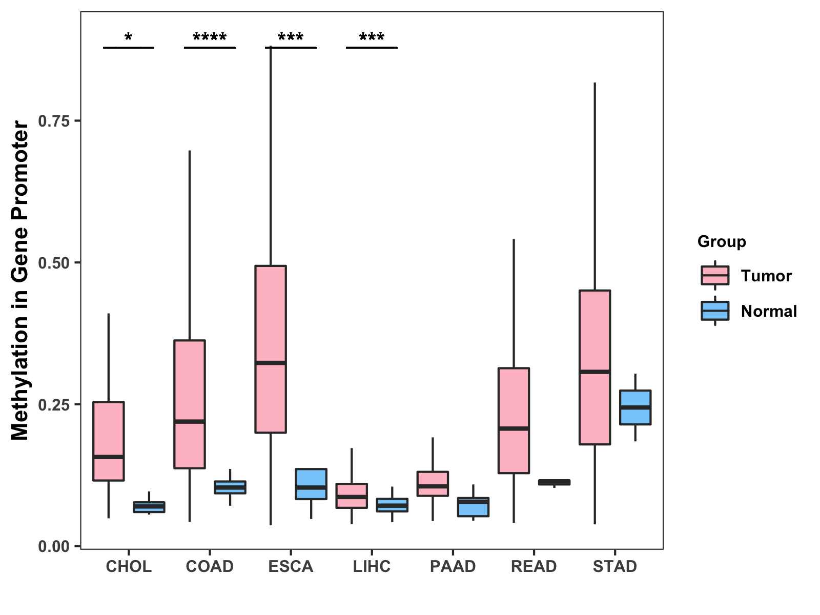 Boxplot of All Gastrointestinal Cancer ( * : 0.01-0.05 , ** : 0.005-0.01 , *** : 0.0001-0.005 , **** : < 0.0001 ) |