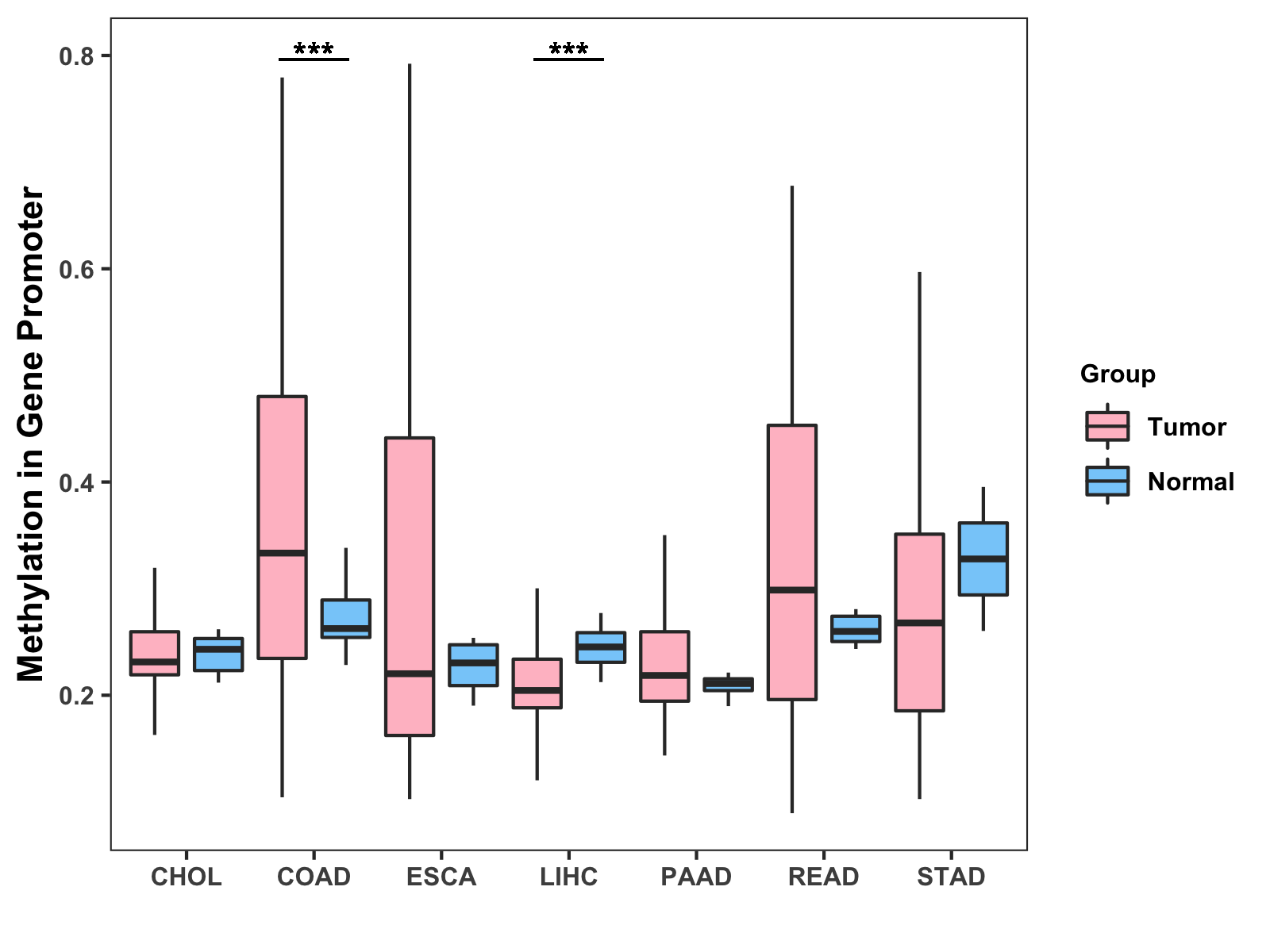 Boxplot of All Gastrointestinal Cancer ( * : 0.01-0.05 , ** : 0.005-0.01 , *** : 0.0001-0.005 , **** : < 0.0001 ) |