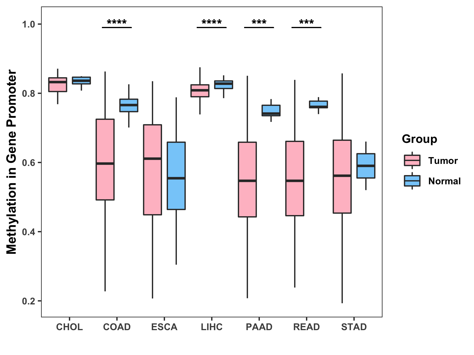 Boxplot of All Gastrointestinal Cancer ( * : 0.01-0.05 , ** : 0.005-0.01 , *** : 0.0001-0.005 , **** : < 0.0001 ) |