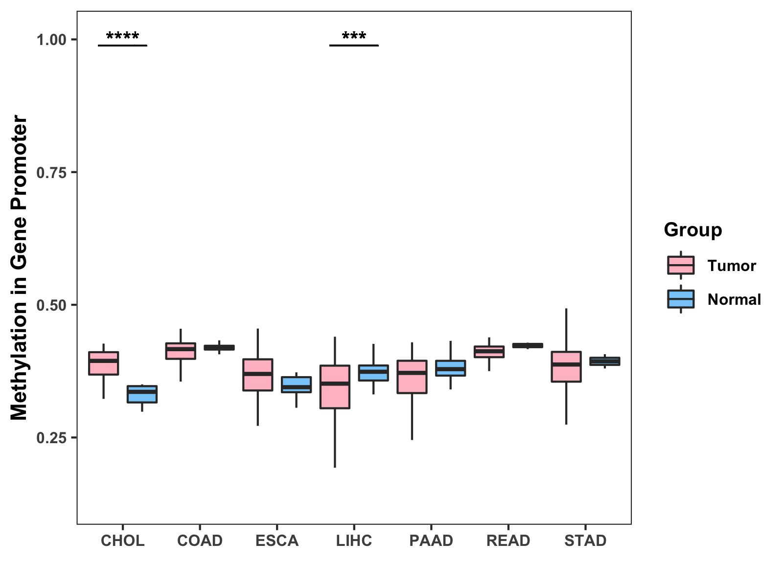 Boxplot of All Gastrointestinal Cancer ( * : 0.01-0.05 , ** : 0.005-0.01 , *** : 0.0001-0.005 , **** : < 0.0001 ) |