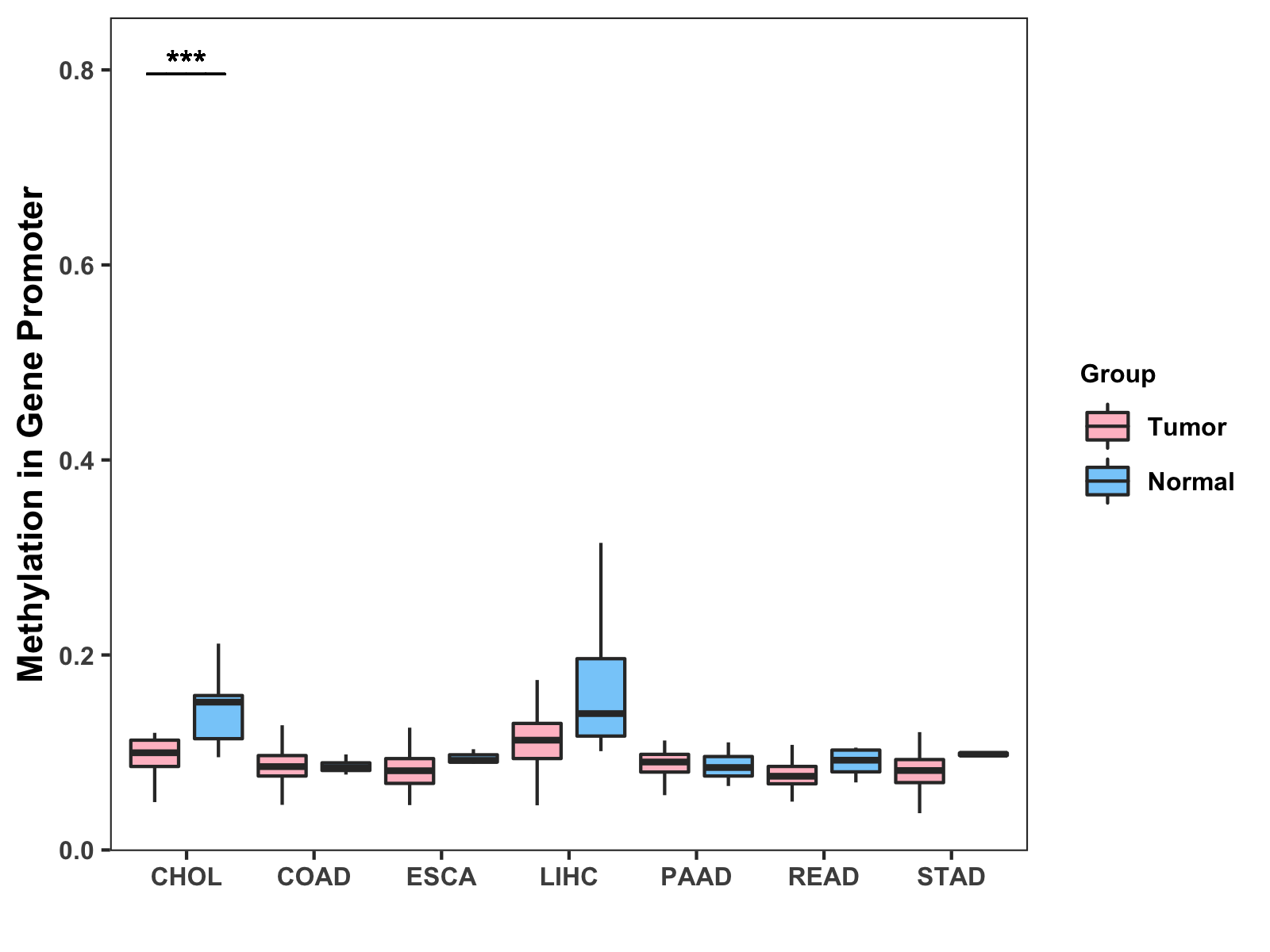 Boxplot of All Gastrointestinal Cancer ( * : 0.01-0.05 , ** : 0.005-0.01 , *** : 0.0001-0.005 , **** : < 0.0001 ) |