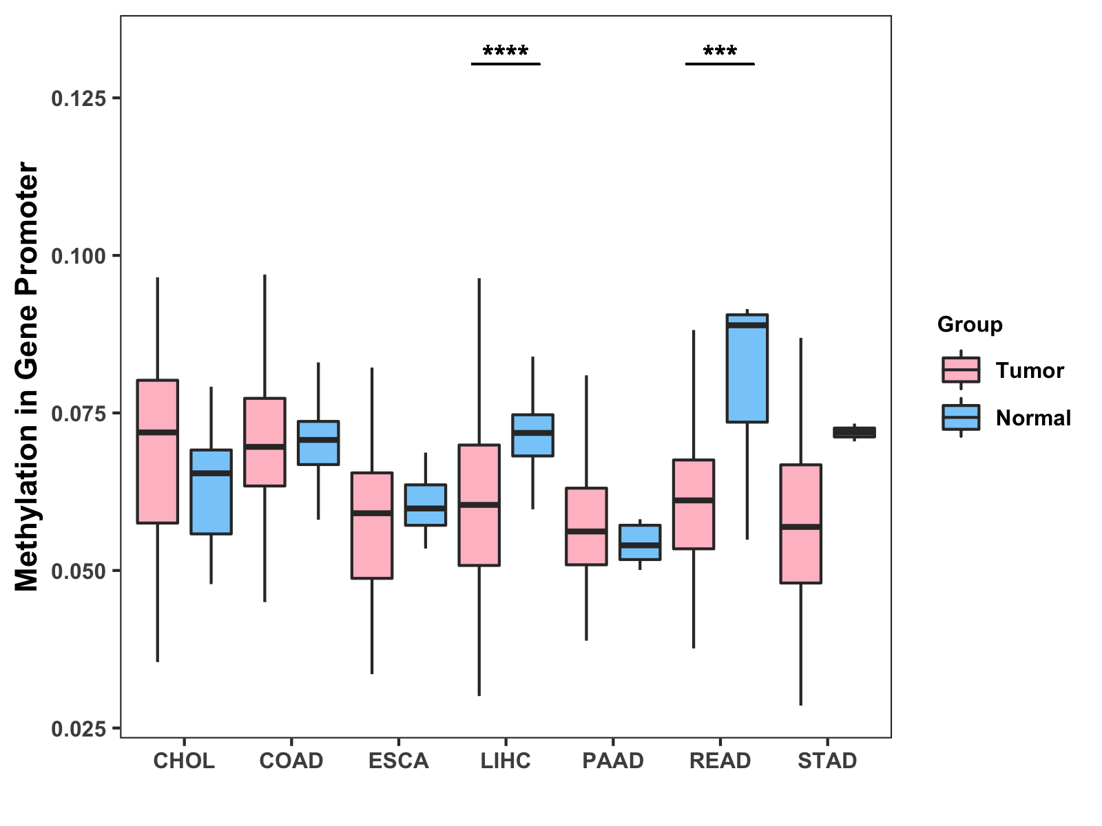 Boxplot of All Gastrointestinal Cancer ( * : 0.01-0.05 , ** : 0.005-0.01 , *** : 0.0001-0.005 , **** : < 0.0001 ) |