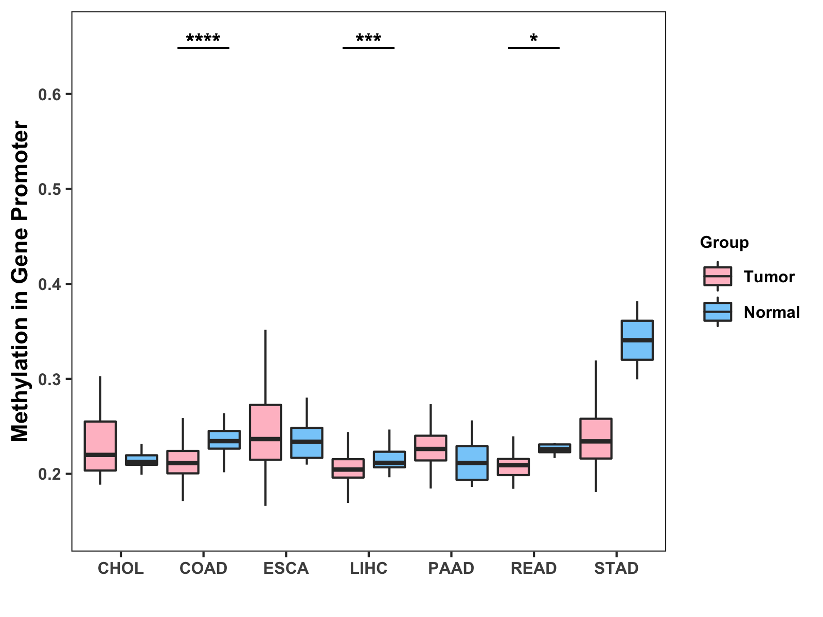 Boxplot of All Gastrointestinal Cancer ( * : 0.01-0.05 , ** : 0.005-0.01 , *** : 0.0001-0.005 , **** : < 0.0001 ) |