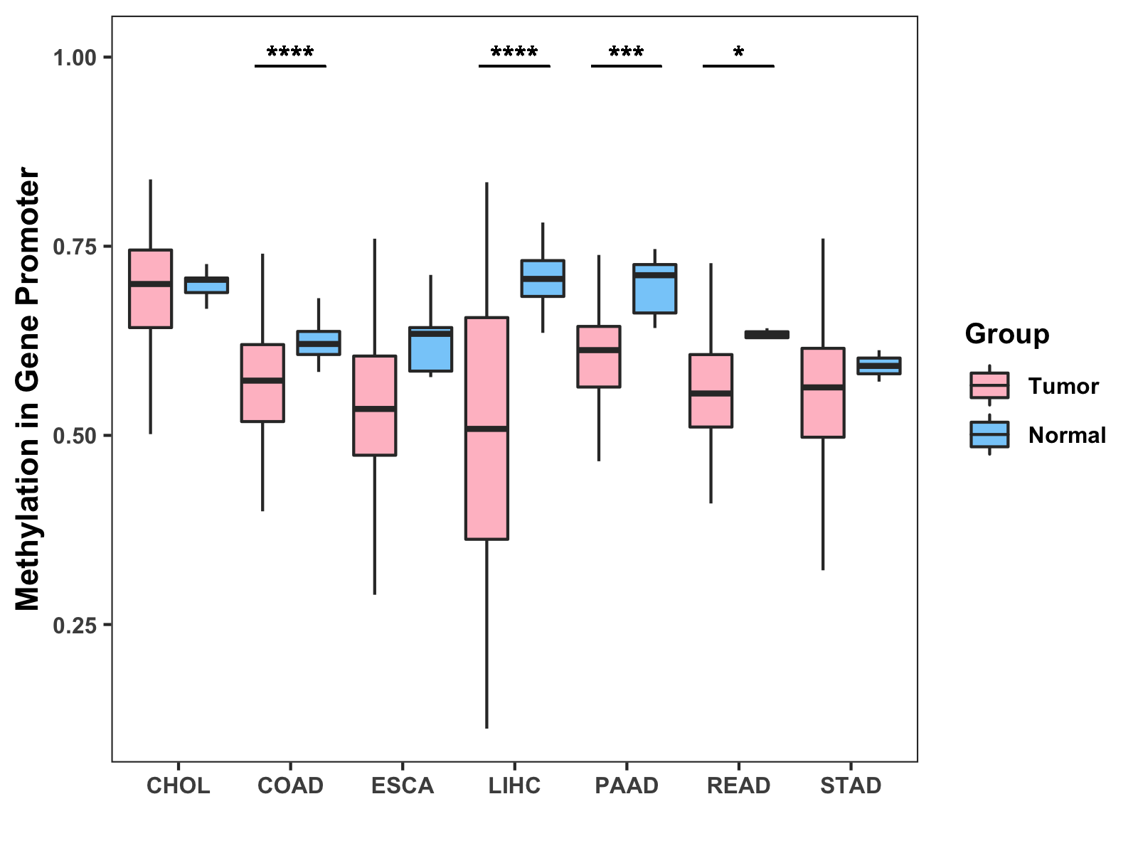 Boxplot of All Gastrointestinal Cancer ( * : 0.01-0.05 , ** : 0.005-0.01 , *** : 0.0001-0.005 , **** : < 0.0001 ) |