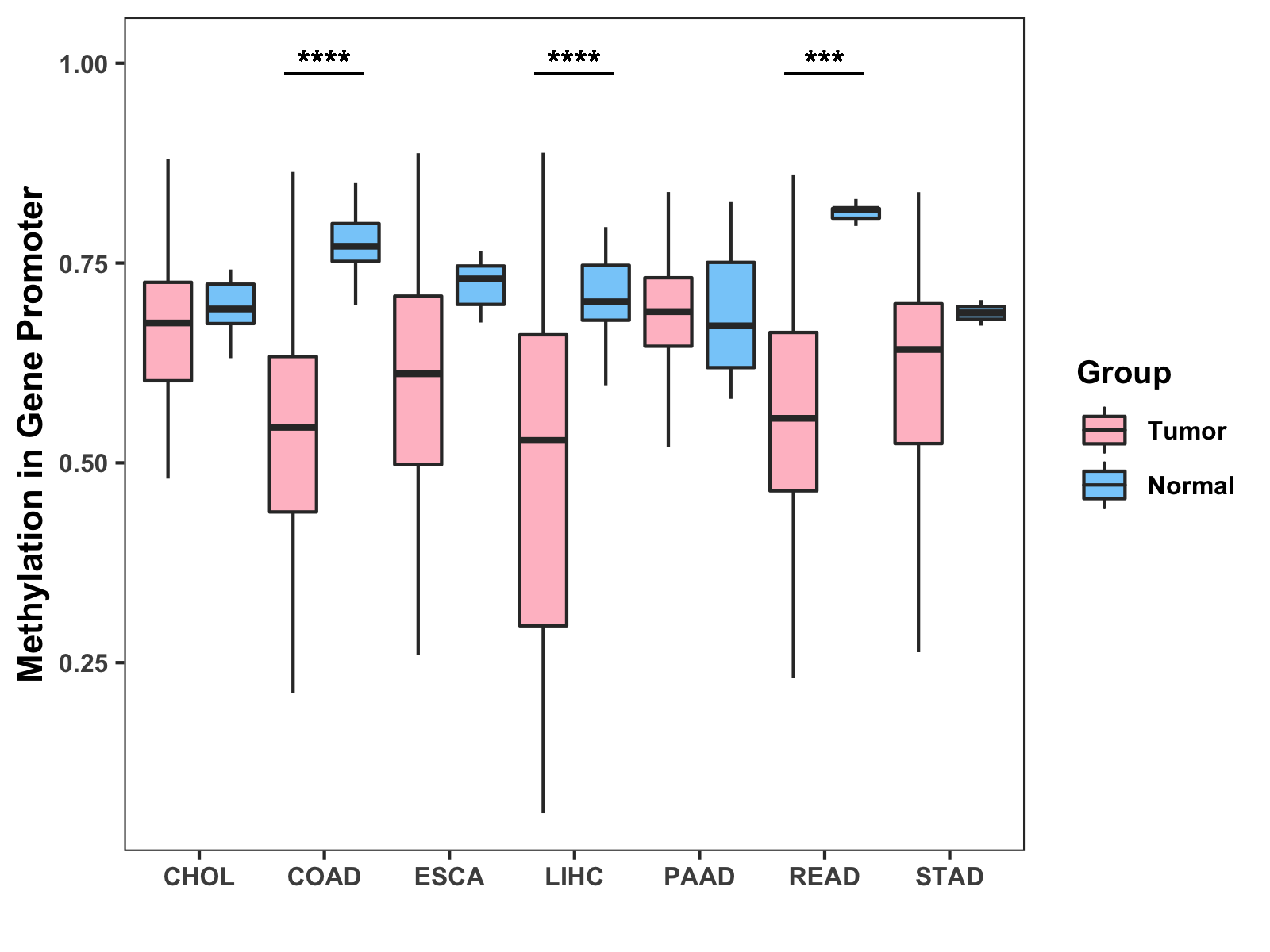 Boxplot of All Gastrointestinal Cancer ( * : 0.01-0.05 , ** : 0.005-0.01 , *** : 0.0001-0.005 , **** : < 0.0001 ) |