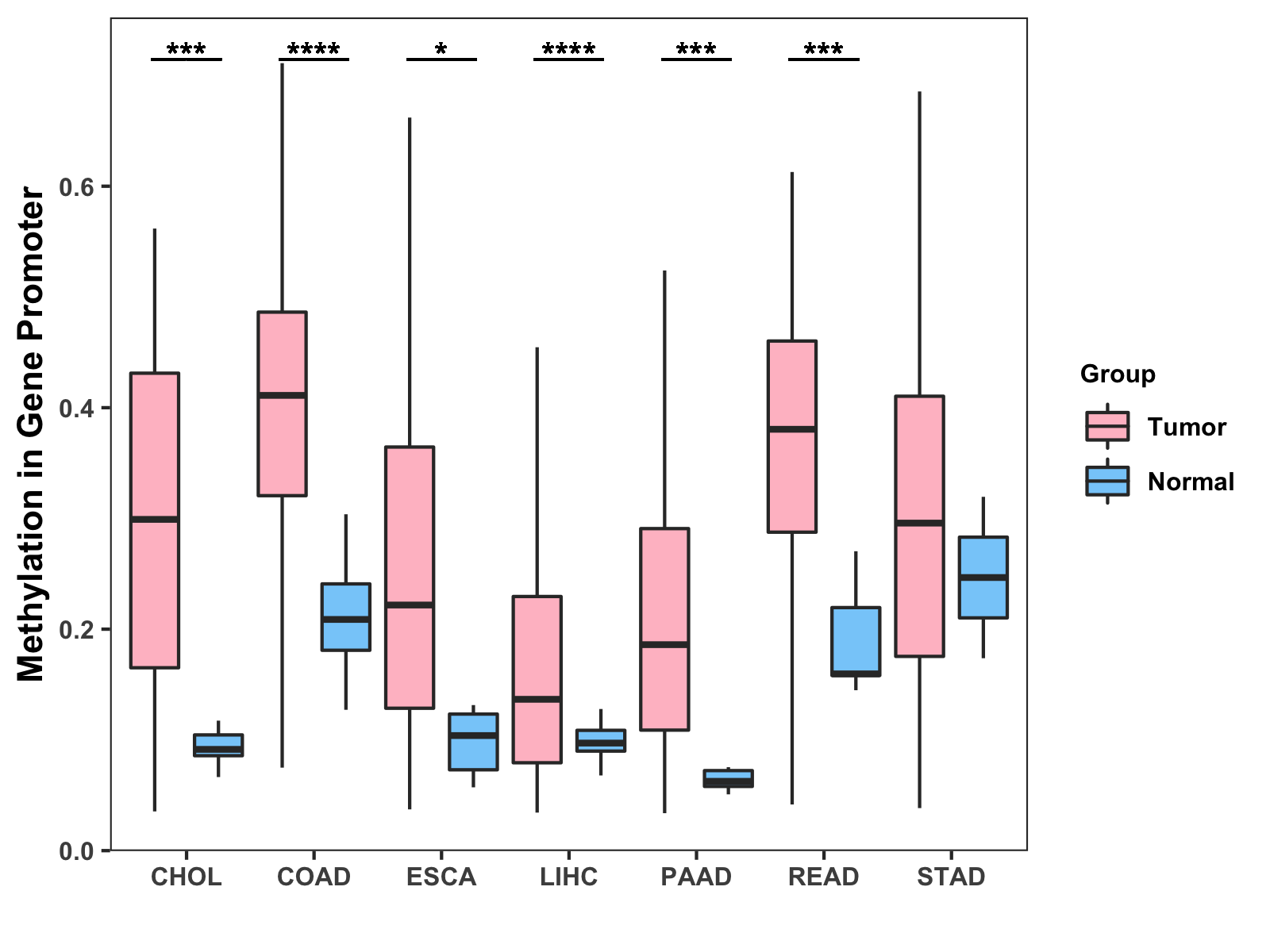 Boxplot of All Gastrointestinal Cancer ( * : 0.01-0.05 , ** : 0.005-0.01 , *** : 0.0001-0.005 , **** : < 0.0001 ) |
