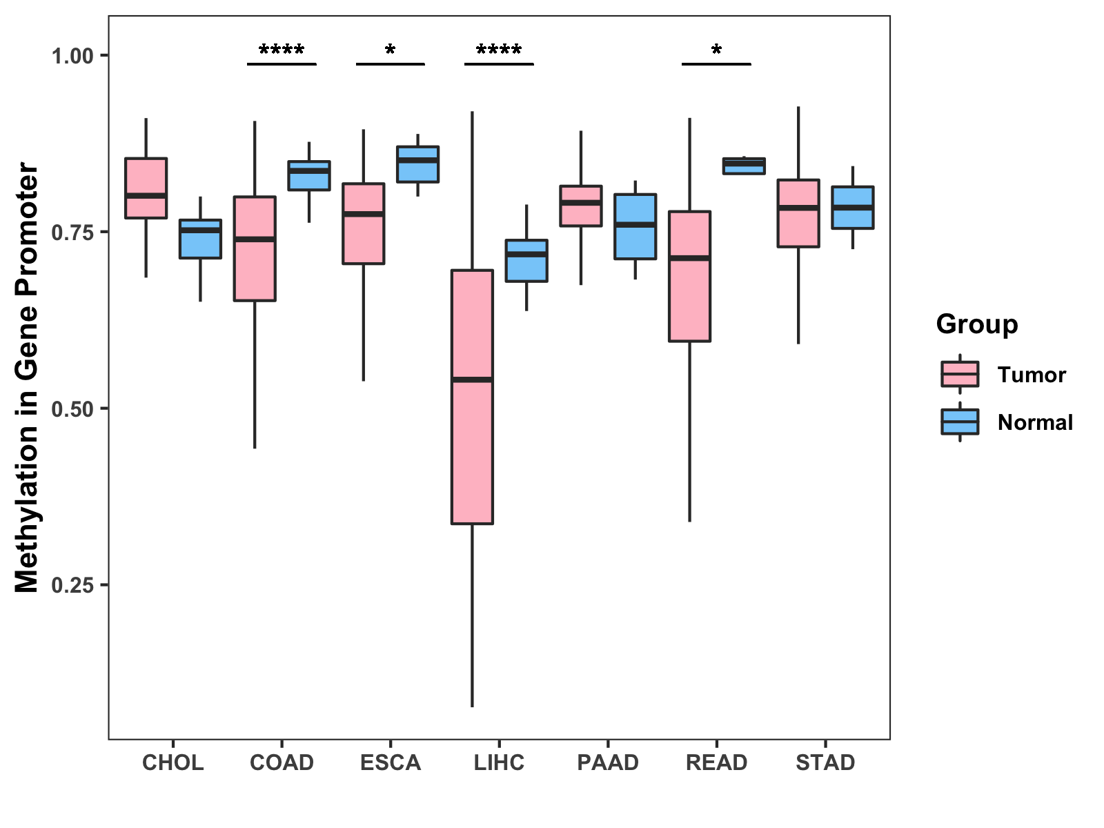 Boxplot of All Gastrointestinal Cancer ( * : 0.01-0.05 , ** : 0.005-0.01 , *** : 0.0001-0.005 , **** : < 0.0001 ) |