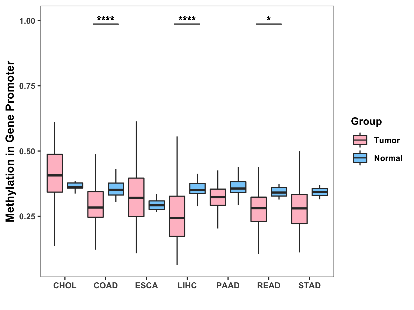 Boxplot of All Gastrointestinal Cancer ( * : 0.01-0.05 , ** : 0.005-0.01 , *** : 0.0001-0.005 , **** : < 0.0001 ) |