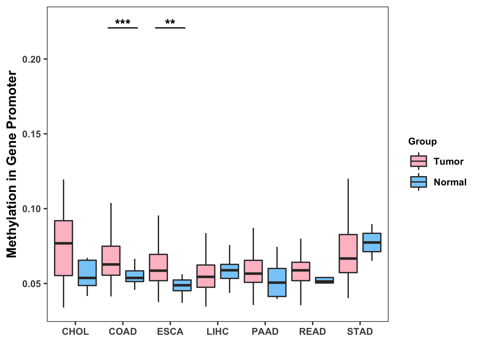 Boxplot of All Gastrointestinal Cancer ( * : 0.01-0.05 , ** : 0.005-0.01 , *** : 0.0001-0.005 , **** : < 0.0001 ) |