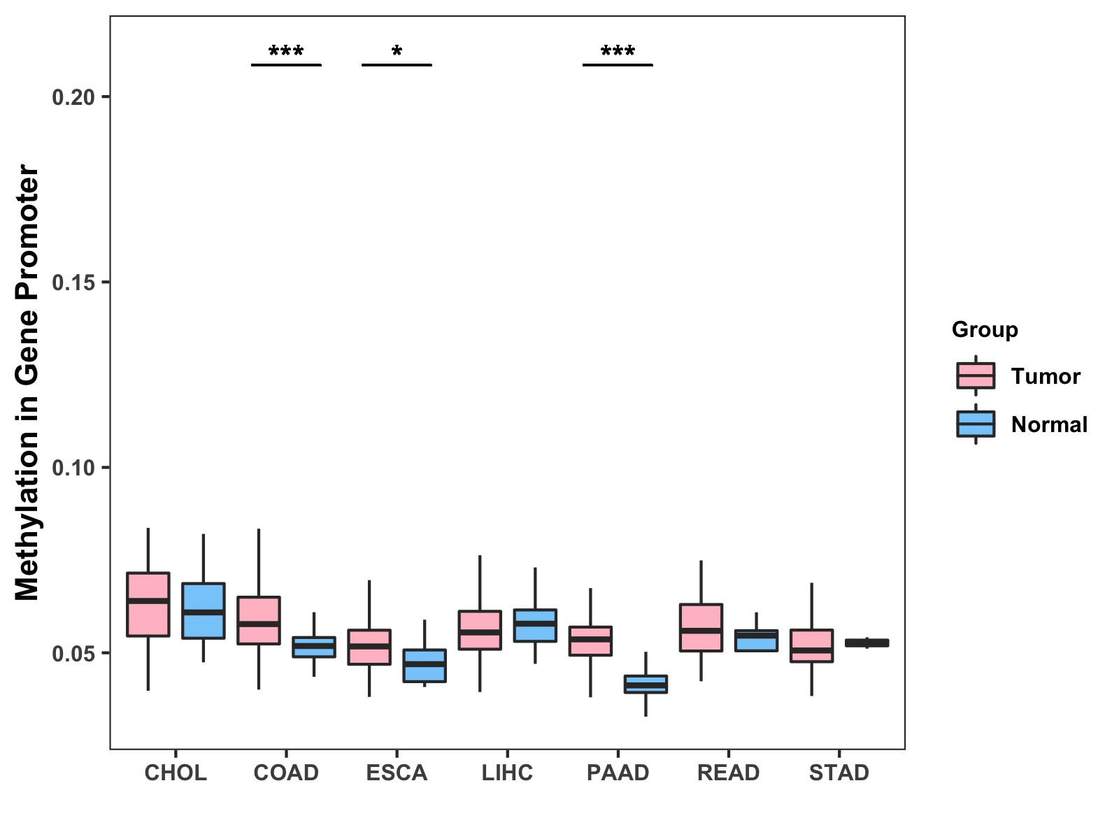 Boxplot of All Gastrointestinal Cancer ( * : 0.01-0.05 , ** : 0.005-0.01 , *** : 0.0001-0.005 , **** : < 0.0001 ) |