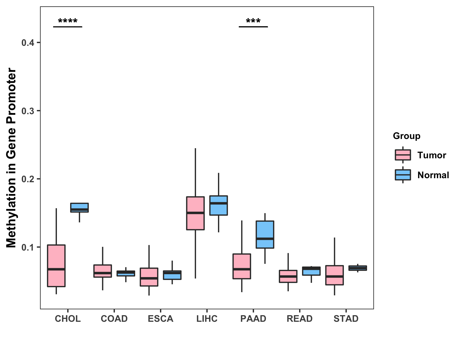 Boxplot of All Gastrointestinal Cancer ( * : 0.01-0.05 , ** : 0.005-0.01 , *** : 0.0001-0.005 , **** : < 0.0001 ) |