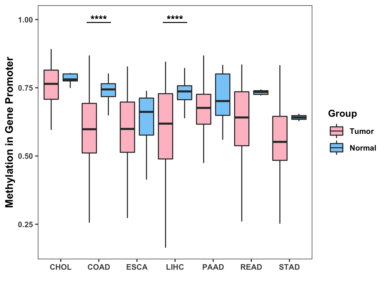 Boxplot of All Gastrointestinal Cancer ( * : 0.01-0.05 , ** : 0.005-0.01 , *** : 0.0001-0.005 , **** : < 0.0001 ) |