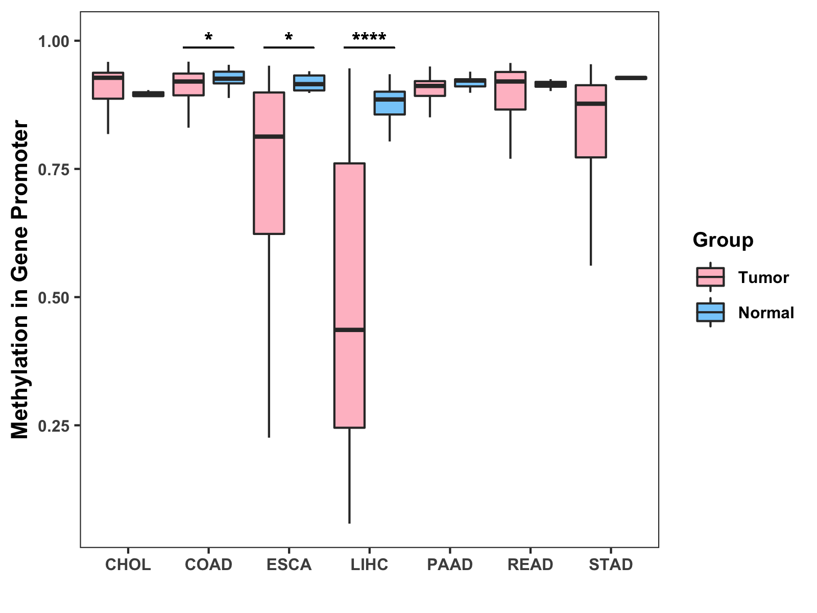 Boxplot of All Gastrointestinal Cancer ( * : 0.01-0.05 , ** : 0.005-0.01 , *** : 0.0001-0.005 , **** : < 0.0001 ) |