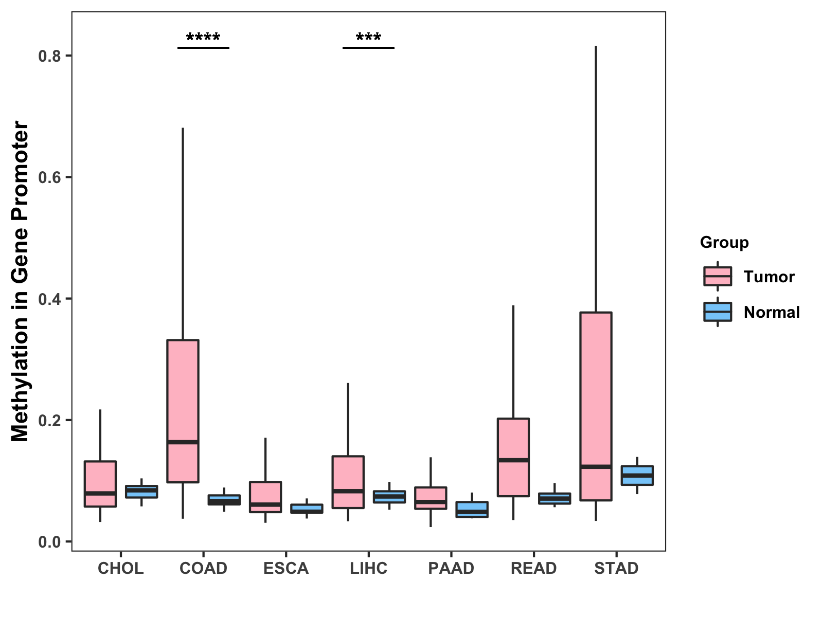 Boxplot of All Gastrointestinal Cancer ( * : 0.01-0.05 , ** : 0.005-0.01 , *** : 0.0001-0.005 , **** : < 0.0001 ) |