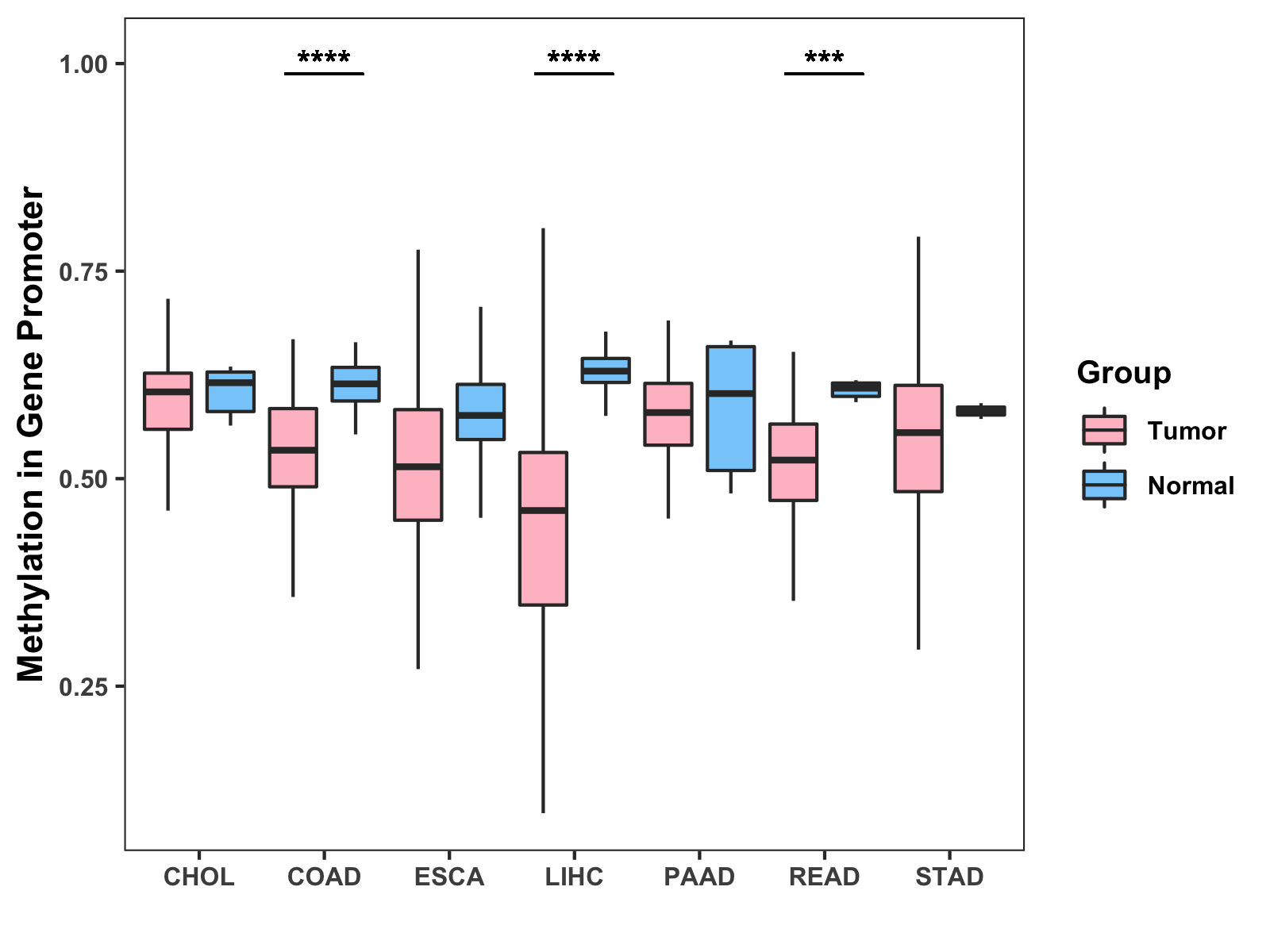 Boxplot of All Gastrointestinal Cancer ( * : 0.01-0.05 , ** : 0.005-0.01 , *** : 0.0001-0.005 , **** : < 0.0001 ) |