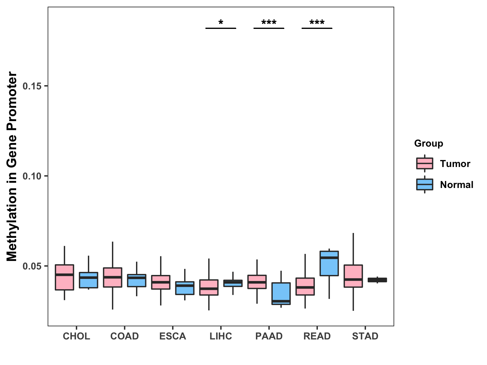 Boxplot of All Gastrointestinal Cancer ( * : 0.01-0.05 , ** : 0.005-0.01 , *** : 0.0001-0.005 , **** : < 0.0001 ) |