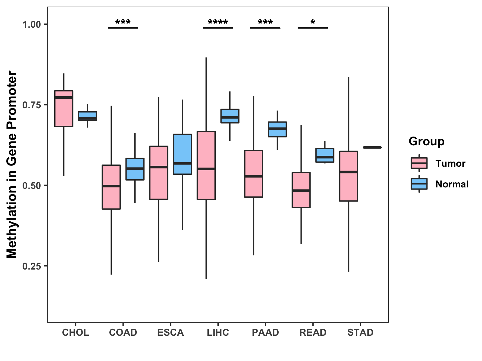 Boxplot of All Gastrointestinal Cancer ( * : 0.01-0.05 , ** : 0.005-0.01 , *** : 0.0001-0.005 , **** : < 0.0001 ) |